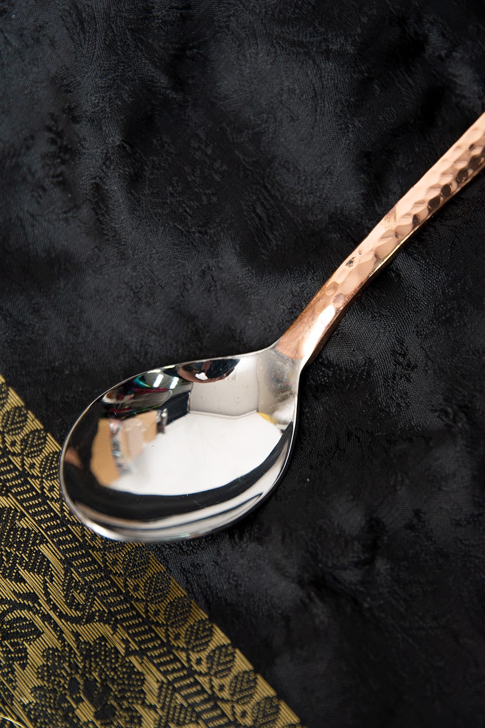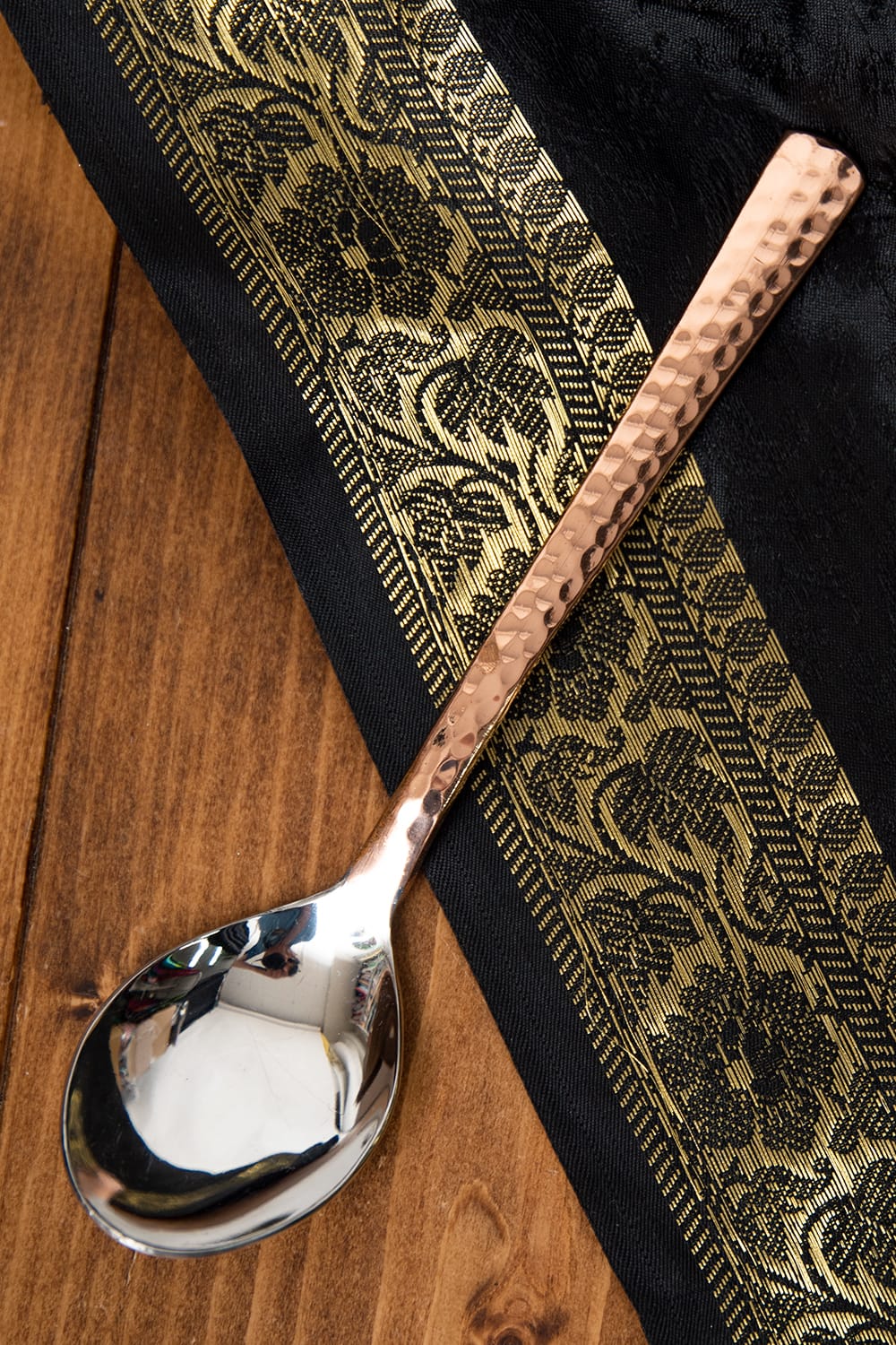 インドでの食事というと、あまりスプーンを使わないというイメージがあるかもしれないのですが、実は色々な場面で使われています。インドのインド料理店でも高級店で使っているテーブルスプーンがこちら。ステンレスのスプーンにカッパー加工が施され、重量感と高級感がある特別なスプーンです。落ち着いた銅の色合いに槌目がさまざまな光を反射して、眺めているだけでもうっとりしてくるきれいな一品です。飽きの来ないデザインに、大きなサイズでお料理の取り分けや、盛り付けに便利ですよ。