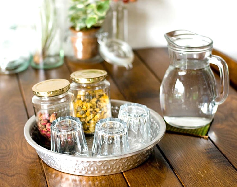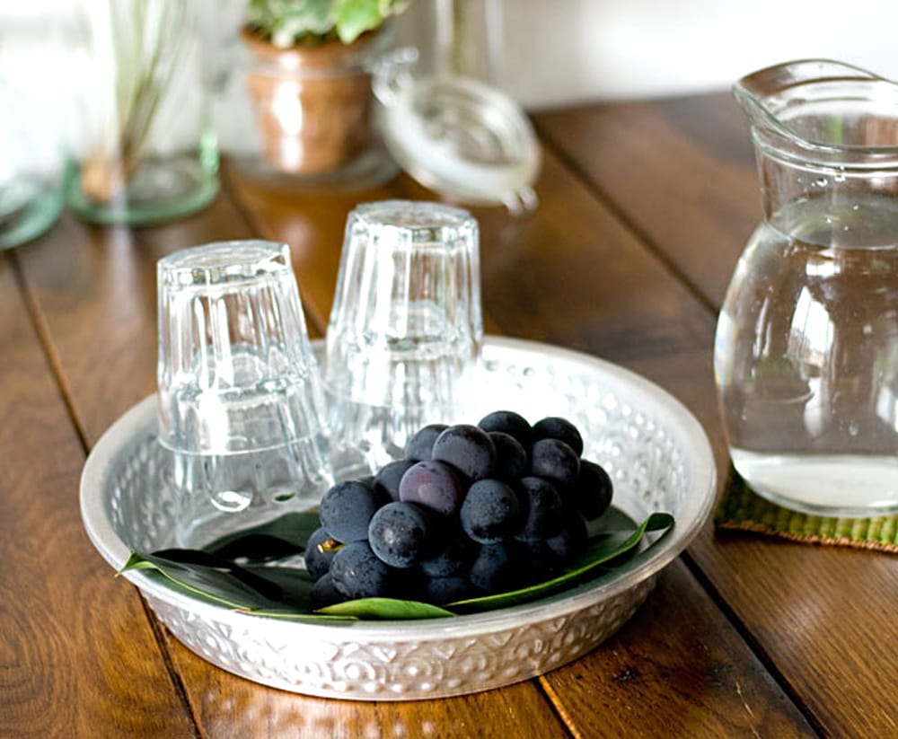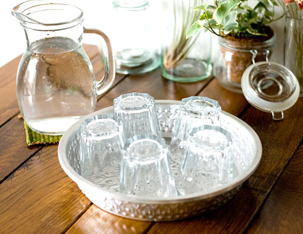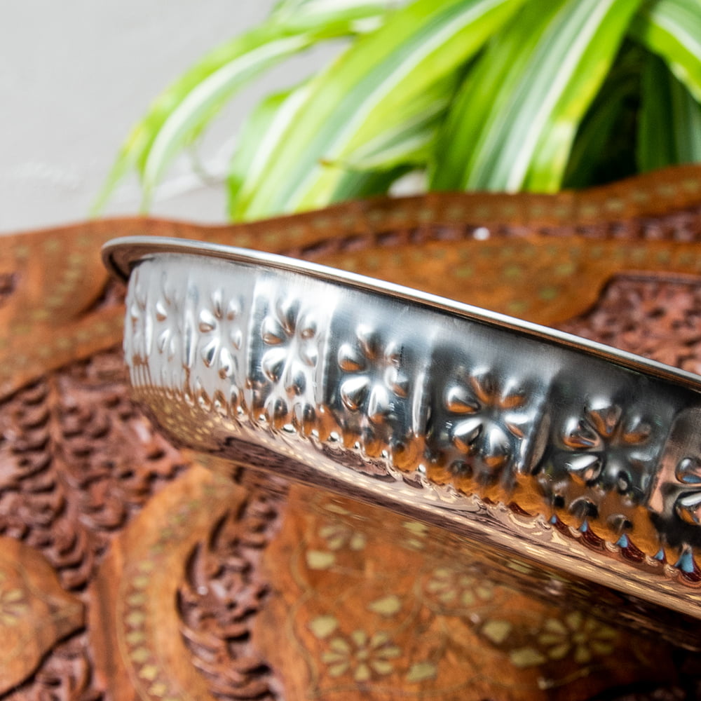 バリからやってきたアルミの飾り皿です。側面と底面に模様が入っていますので、とってもきれいです。この模様はバリの職人さんのハンドメイド。一点一点、コンコンと叩いて製作しています。お盆やトレイとしてもお使いいただける大きさなので、グラスやお菓子、果物を乗せて頂いても素敵ですね。上から見ると大きな花が咲いたような模様になっています。