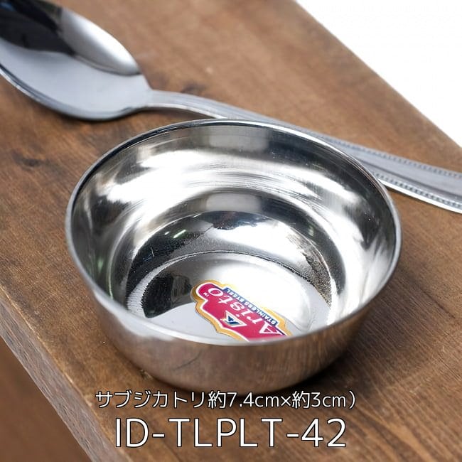 インドでカレーを食べるときに使うステンレス製の小皿。こちらの商品は積み重ねが出来て収納に便利なタイプです。少しお椀状に広がっているのもお洒落で素敵です。小皿の中にカレーやヨーグルトを入れて食べますが、薬味や調味料を入れておくのにも便利です。こちらのサイズは中くらいのタイプで一番使い勝手が良さそうです。サブジ(インドの薬膳野菜蒸し炒め)を盛り付けたり、ダールやカレーを盛り付けたり、色々な使い方ができそう。男性だと少し物足りなくておかわりが欲しくなるかもしれませんね。料理名をイメージして名前をつけてみましたが、もちろん使い方は自由自在です。カレー大皿の上にずらりと並べて豪華絢爛なマサラワールドをご堪能ください!
