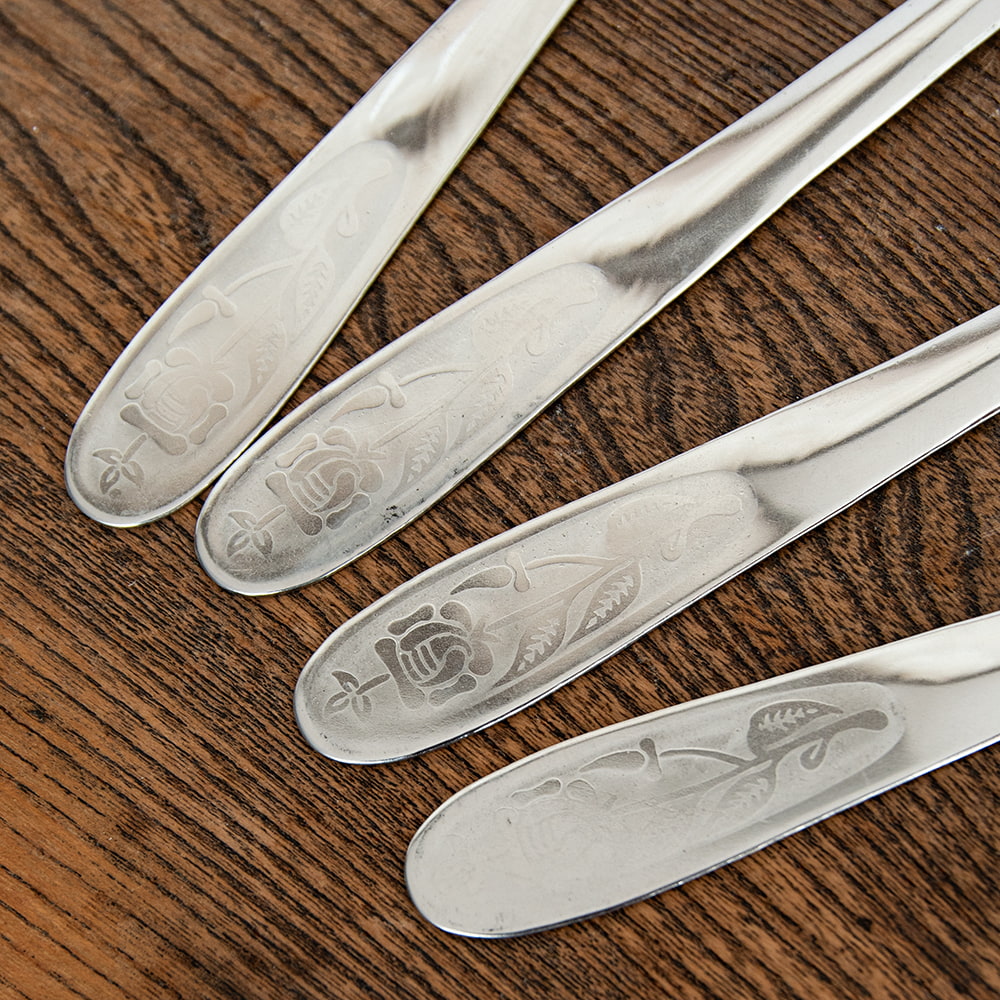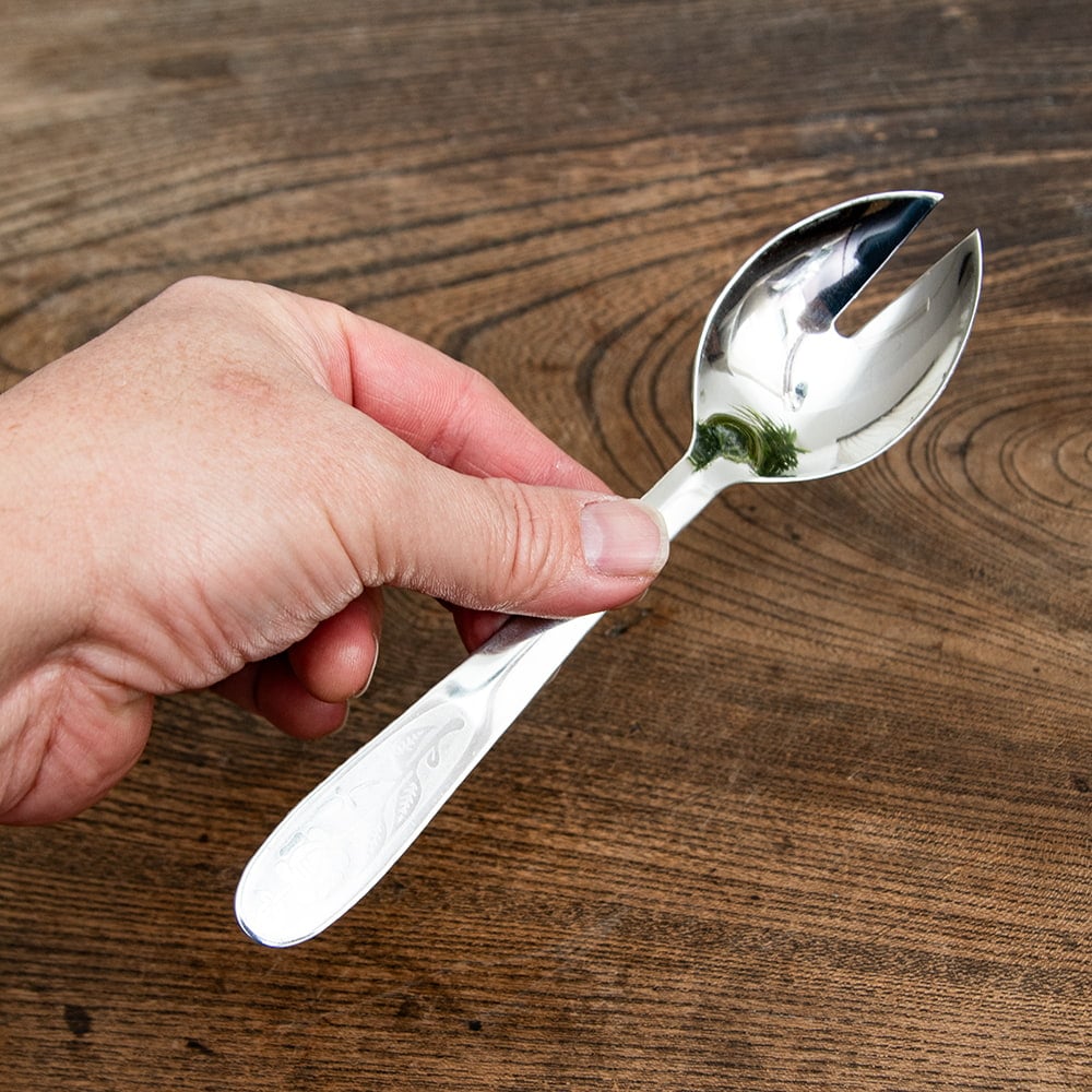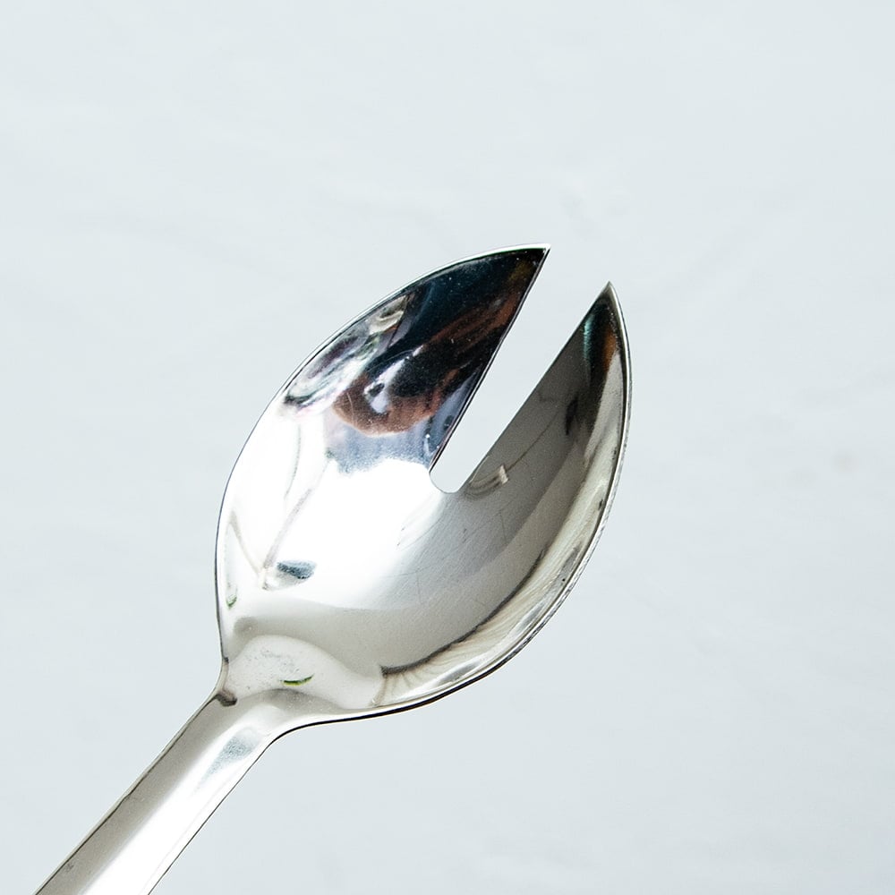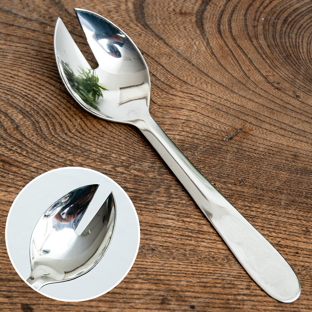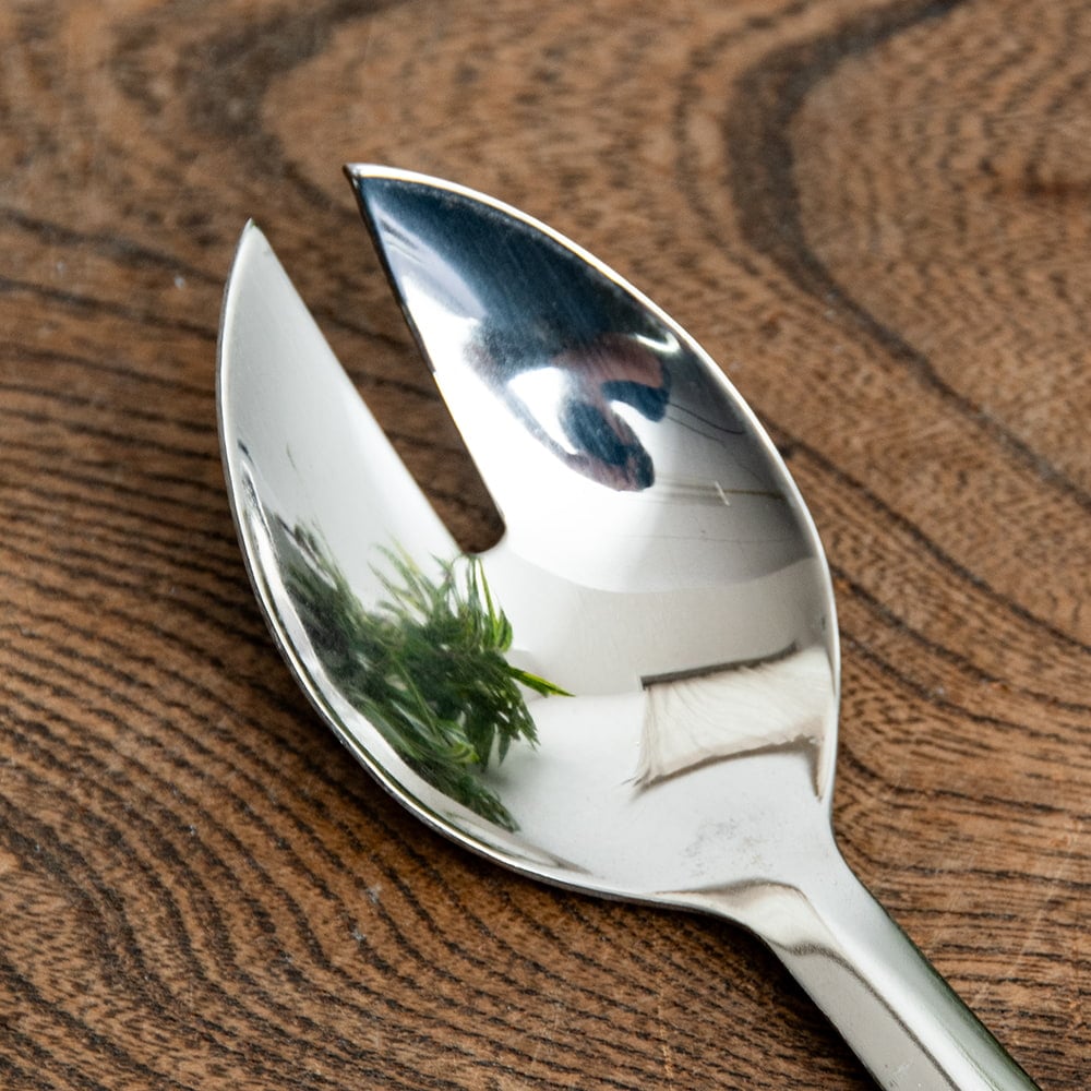 ぶたのヒヅメのような形をした、ちょっと不思議なスタイルのスプーン。ネパールのラムさんの家のパーティに招かれたときに出てきた面白いスプーンです。スプーンやフォークを何本も出すと大変なので、フォークを兼ねたこうした便利スプーンが使われるのだそう。チウラ(干し米)や肉料理、野菜、豆等々が提供されるネパールのカジャ(おやつごはん)が一枚のお皿に提供されるネパールのスタイルでは、切ったり刺したりすくったりできるこのスプーンは確かにとっても便利なのでした。ネパール料理・インド料理のお供にお一つどうぞ ちょっと鋭いので怪我しないようにご注意くださいね。