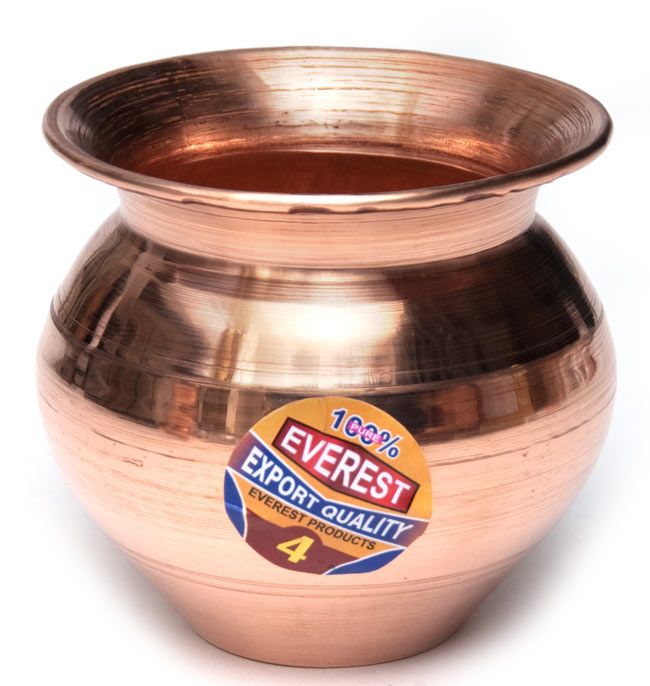 インドで礼拝を行う時にガンジス河の水を入れたり、神様への捧げ物の容器として主に使用される銅の水差しです。銅は、ステンレスよりも神聖な金属とされ、礼拝の時には好んで銅の水差しが使われます。こちらの商品は銅で作られていおり、銅は柔らかい金属なので、日本への輸入の際に生じた凹みがありますので、ご了承ください。