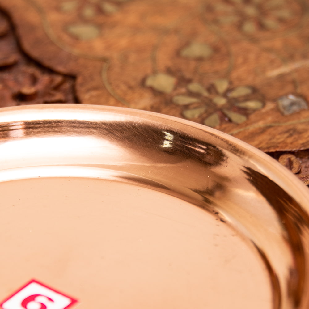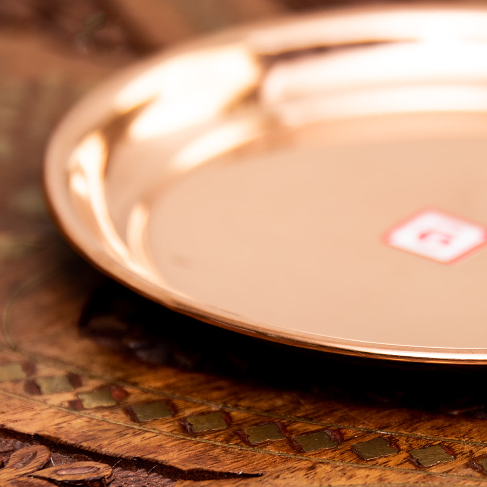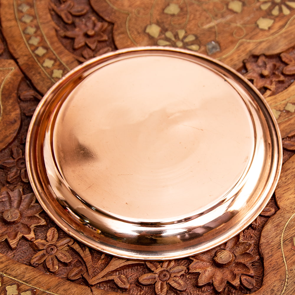 インドでは、ヒンドゥー教の宗教用品として、おかずを盛り付けるために使用されている小皿です。銅はインドでは神聖な金属とされ、宗教的な場所などでよく使われています。ティラキタスタッフもガネーシャの大好物モーダカというお菓子をお供えしていたり、ガンジス河の水をいれていたりする風景を見たことがあります。■お手頃価格な銅仕上げ