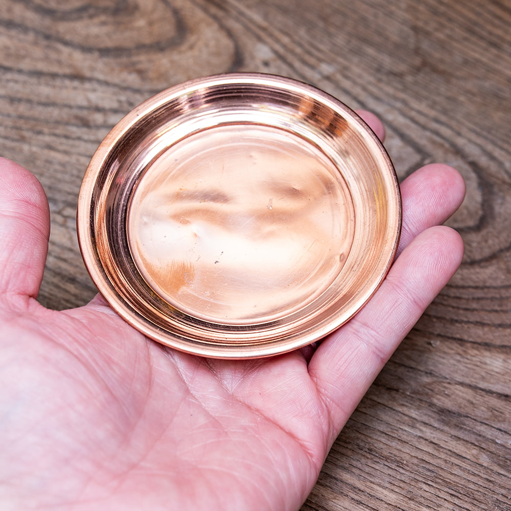 インドでは、ヒンドゥー教の宗教用品として、おかずを盛り付けるために使用されている小皿です。銅はインドでは神聖な金属とされ、宗教的な場所などでよく使われています。ティラキタスタッフもガネーシャの大好物モーダカというお菓子をお供えしていたり、ガンジス河の水をいれていたりする風景を見たことがあります。■銅で出来ています