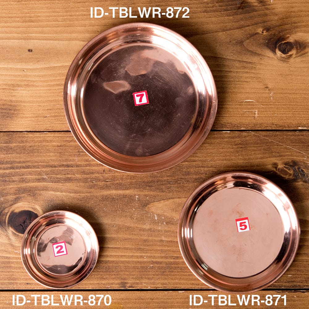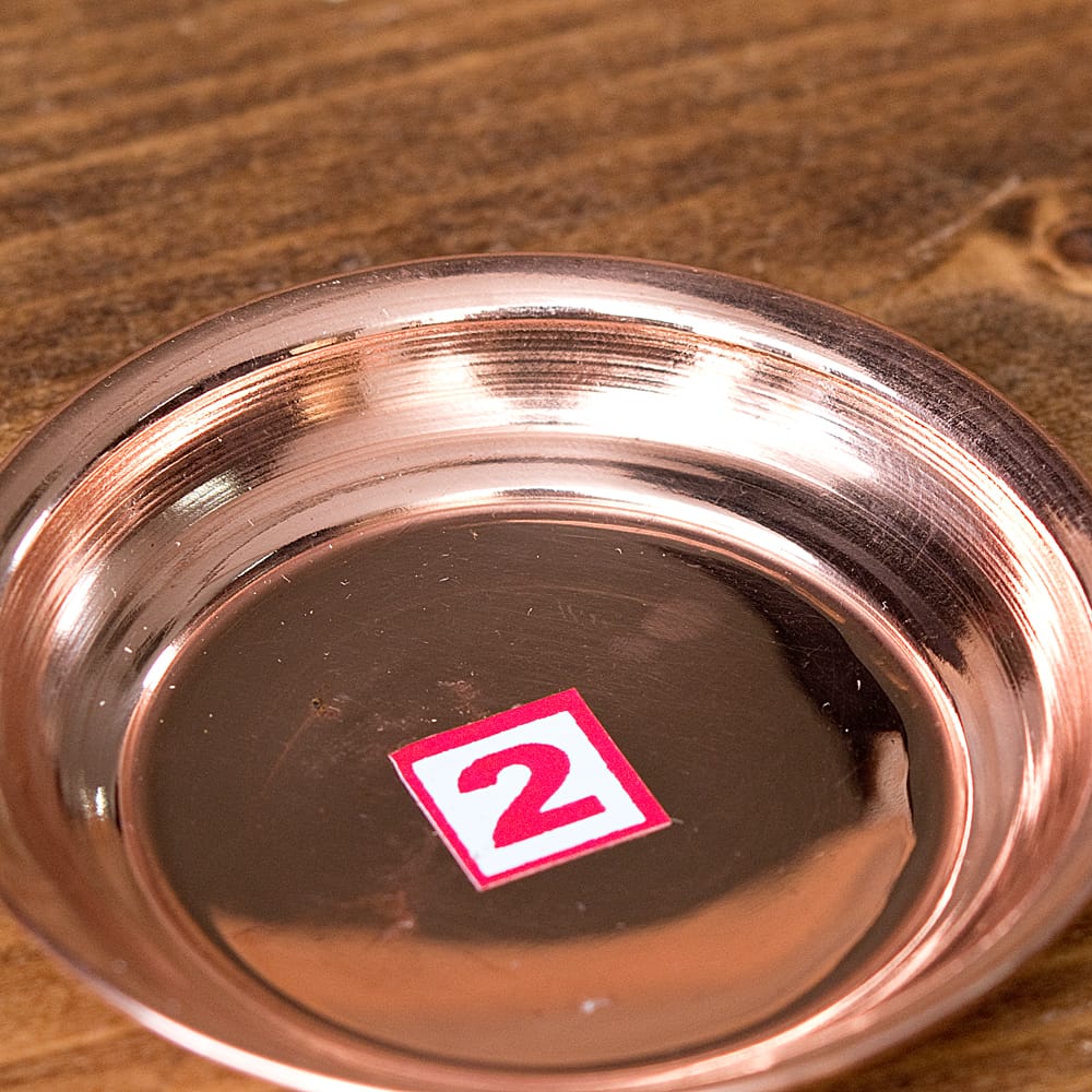 インドでは、ヒンドゥー教の宗教用品として、おかずを盛り付けるために使用されている小皿です。銅はインドでは神聖な金属とされ、宗教的な場所などでよく使われています。ティラキタスタッフもガネーシャの大好物モーダカというお菓子をお供えしていたり、ガンジス河の水をいれていたりする風景を見たことがあります。■お手頃価格な銅仕上げ