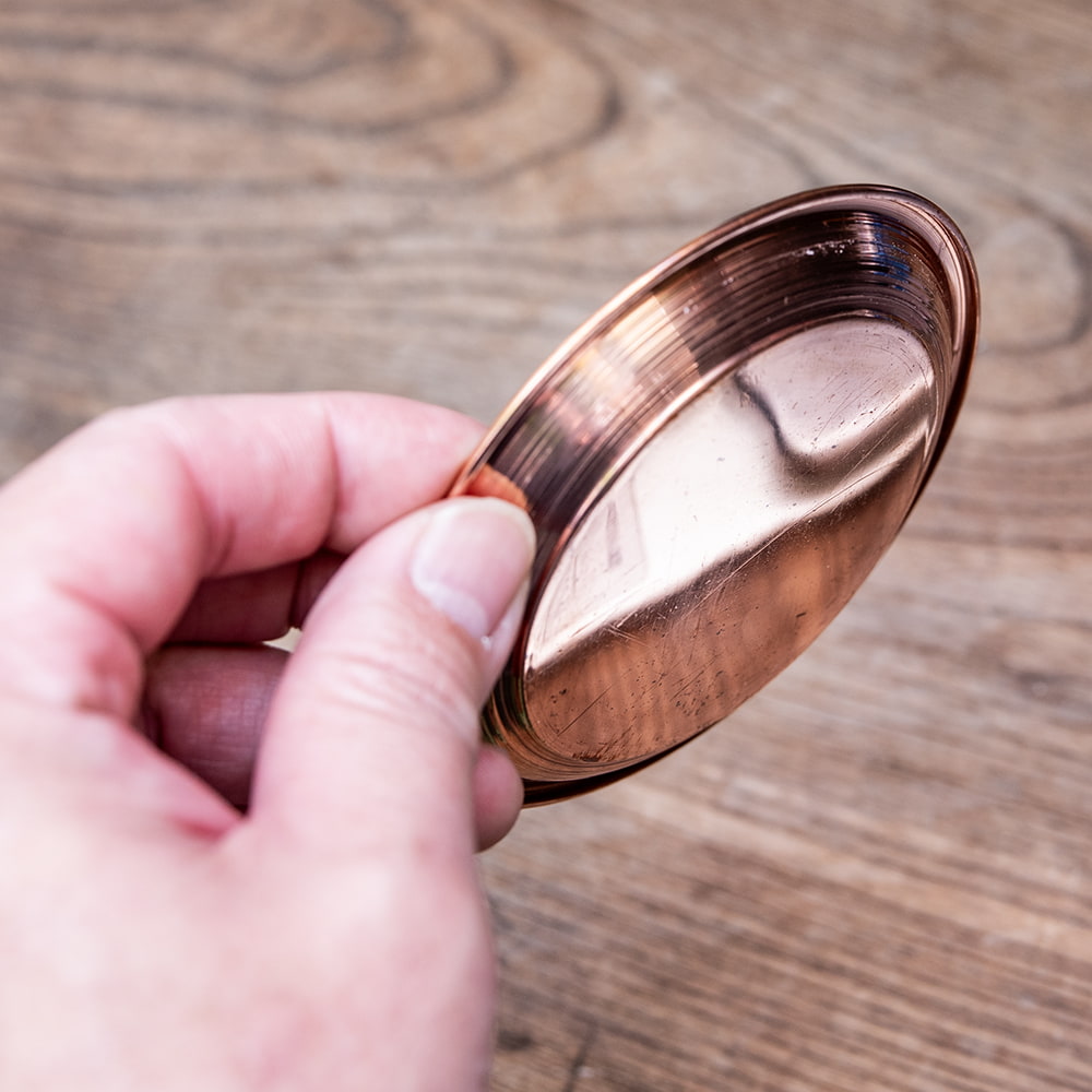 インドでは、ヒンドゥー教の宗教用品として、おかずを盛り付けるために使用されている小皿です。銅はインドでは神聖な金属とされ、宗教的な場所などでよく使われています。ティラキタスタッフもガネーシャの大好物モーダカというお菓子をお供えしていたり、ガンジス河の水をいれていたりする風景を見たことがあります。■銅で出来ています