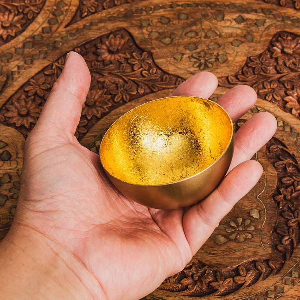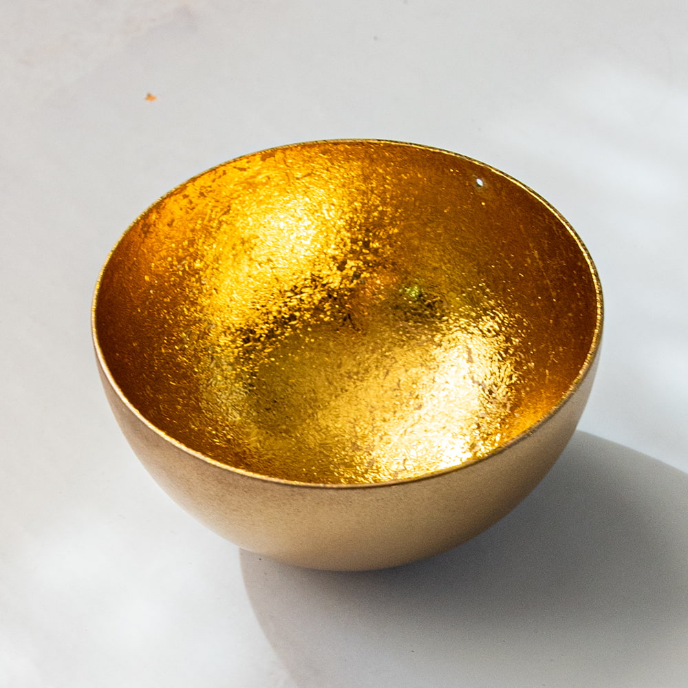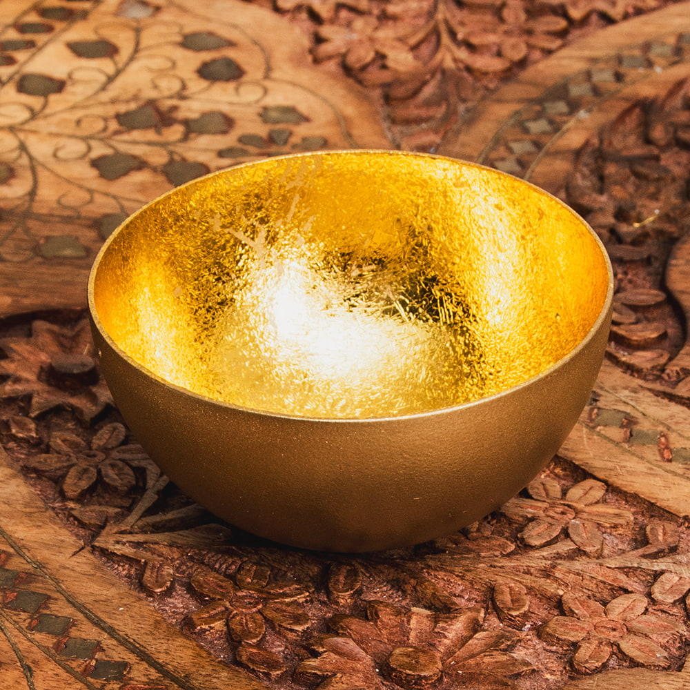 金属工芸の街・モラダバードから美しいインテリアボウルが届きました。インド雑貨らしからぬ(?)洗練されたモダンな質感がとても新鮮です。内側は金箔を貼り合わせたような意匠になっており、複雑に光を反射しますが、それが外側のマットな仕上げと鮮やかなコントラストを演出してくれます。デスク周りを美しく彩る小物入れを始め、キャンドルボウルなど様々な使い方ができますね。クリスタル入れやポプリ入れとしてもオススメです。