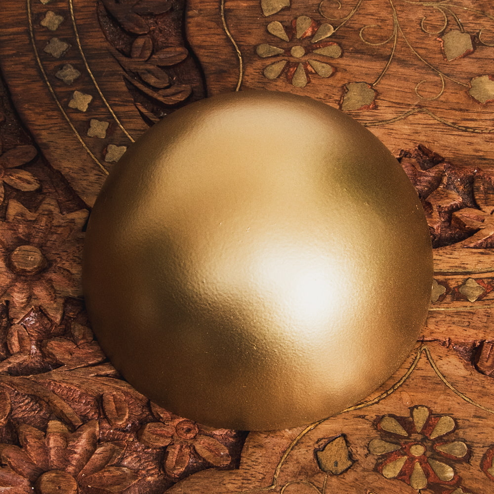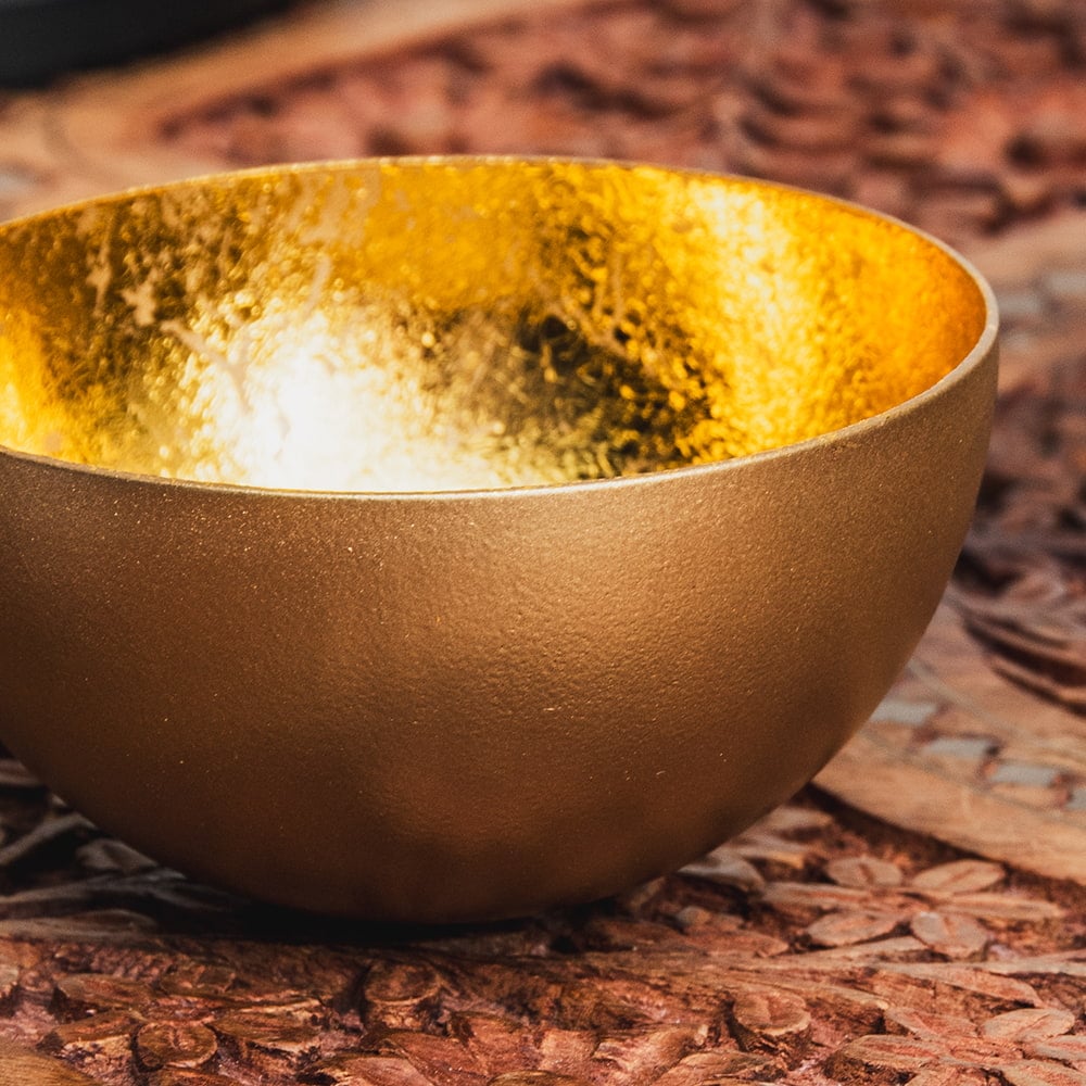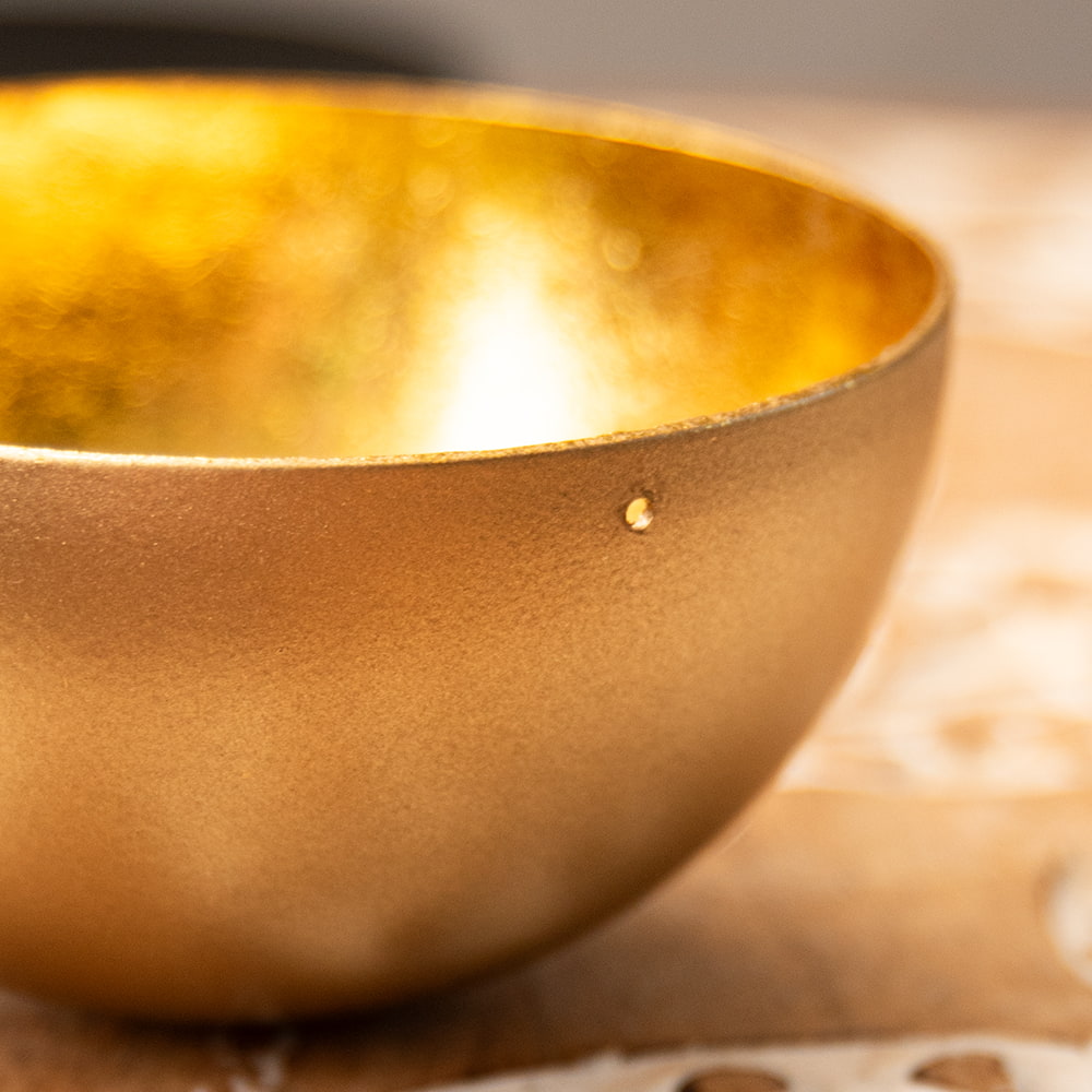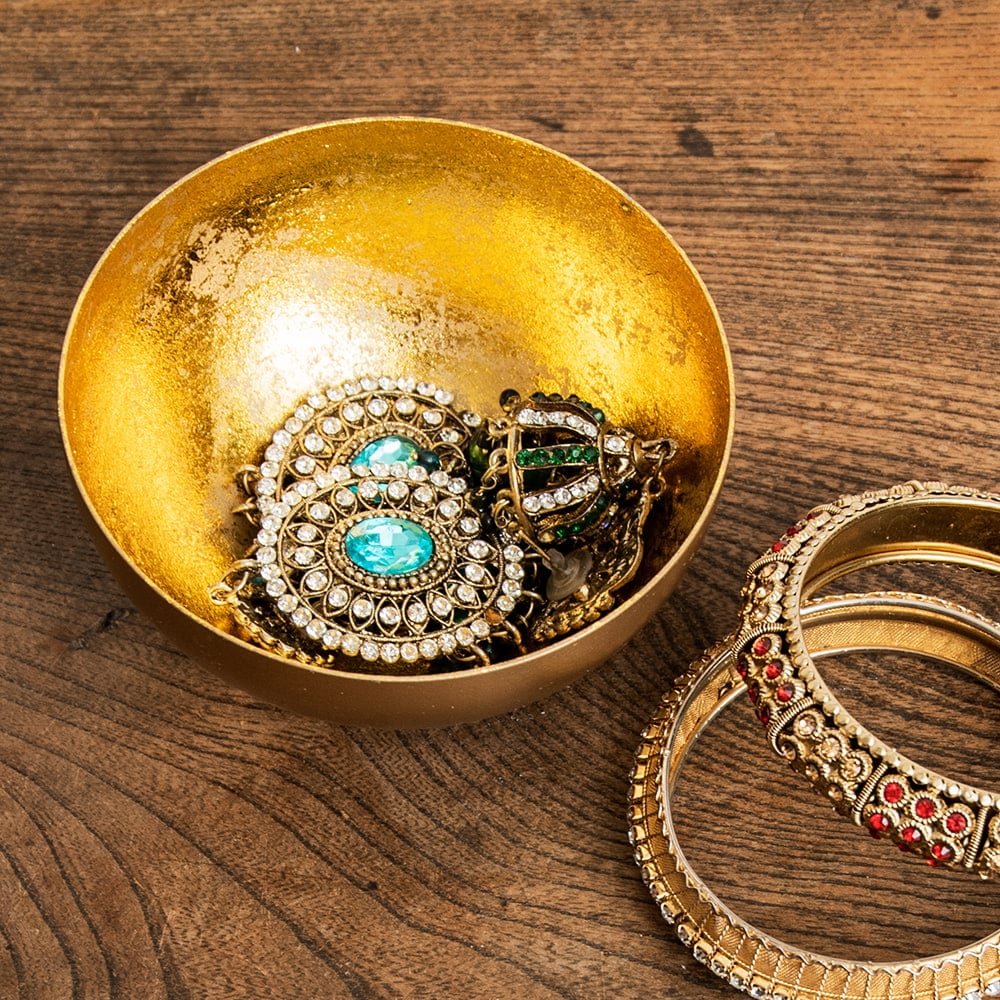 金属工芸の街・モラダバードから美しいインテリアボウルが届きました。インド雑貨らしからぬ(?)洗練されたモダンな質感がとても新鮮です。内側は金箔を貼り合わせたような意匠になっており、複雑に光を反射しますが、それが外側のマットな仕上げと鮮やかなコントラストを演出してくれます。デスク周りを美しく彩る小物入れを始め、キャンドルボウルなど様々な使い方ができますね。クリスタル入れやポプリ入れとしてもオススメです。
