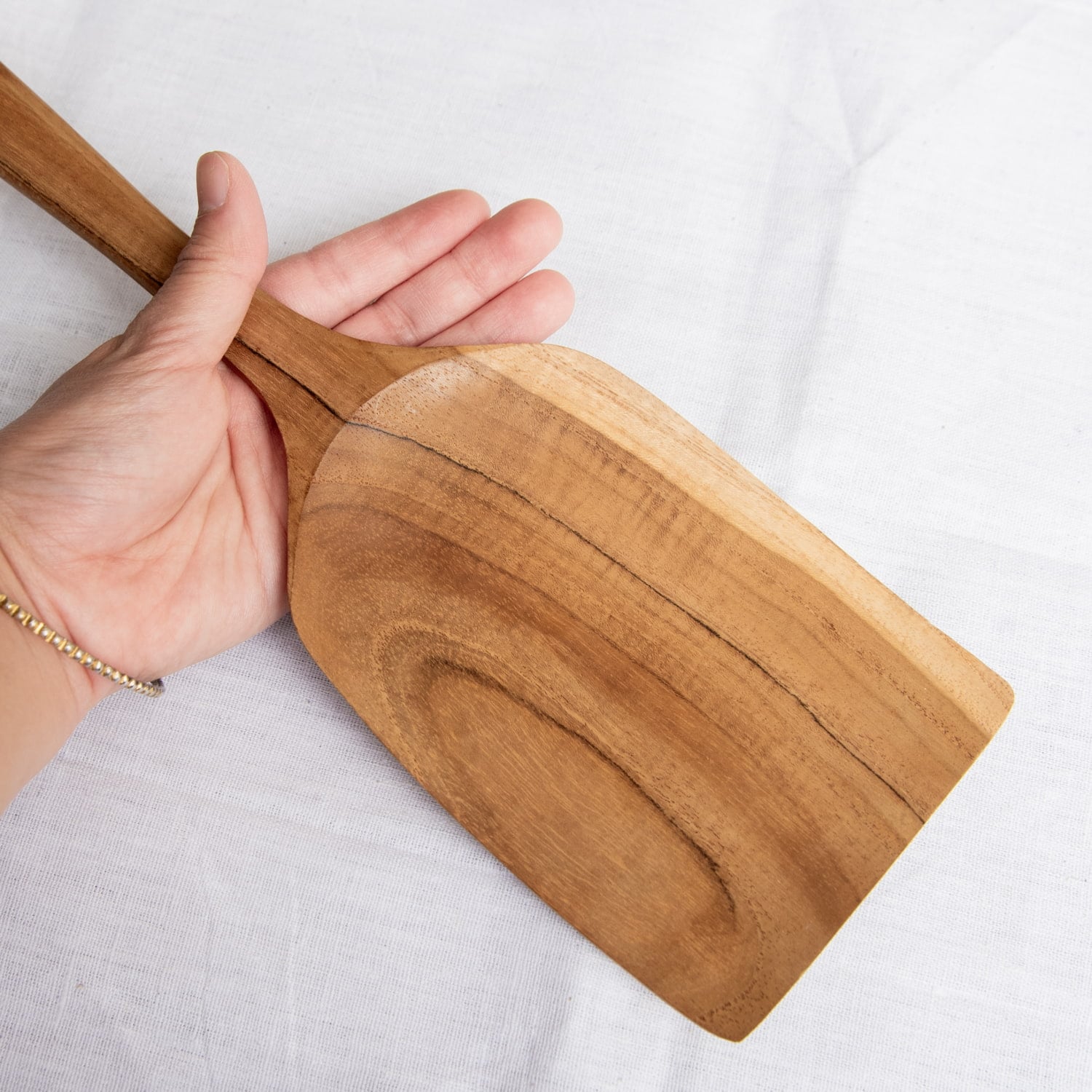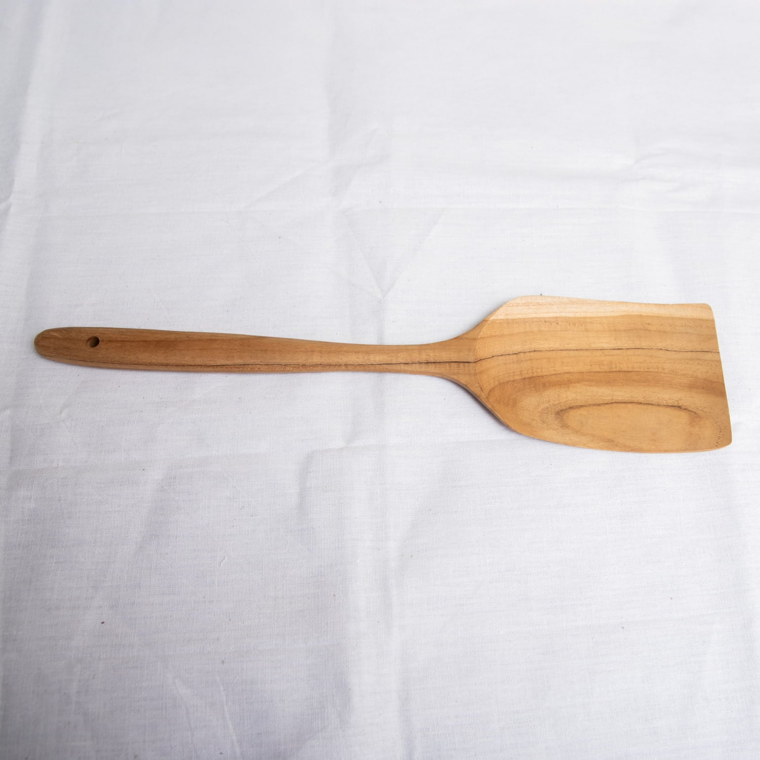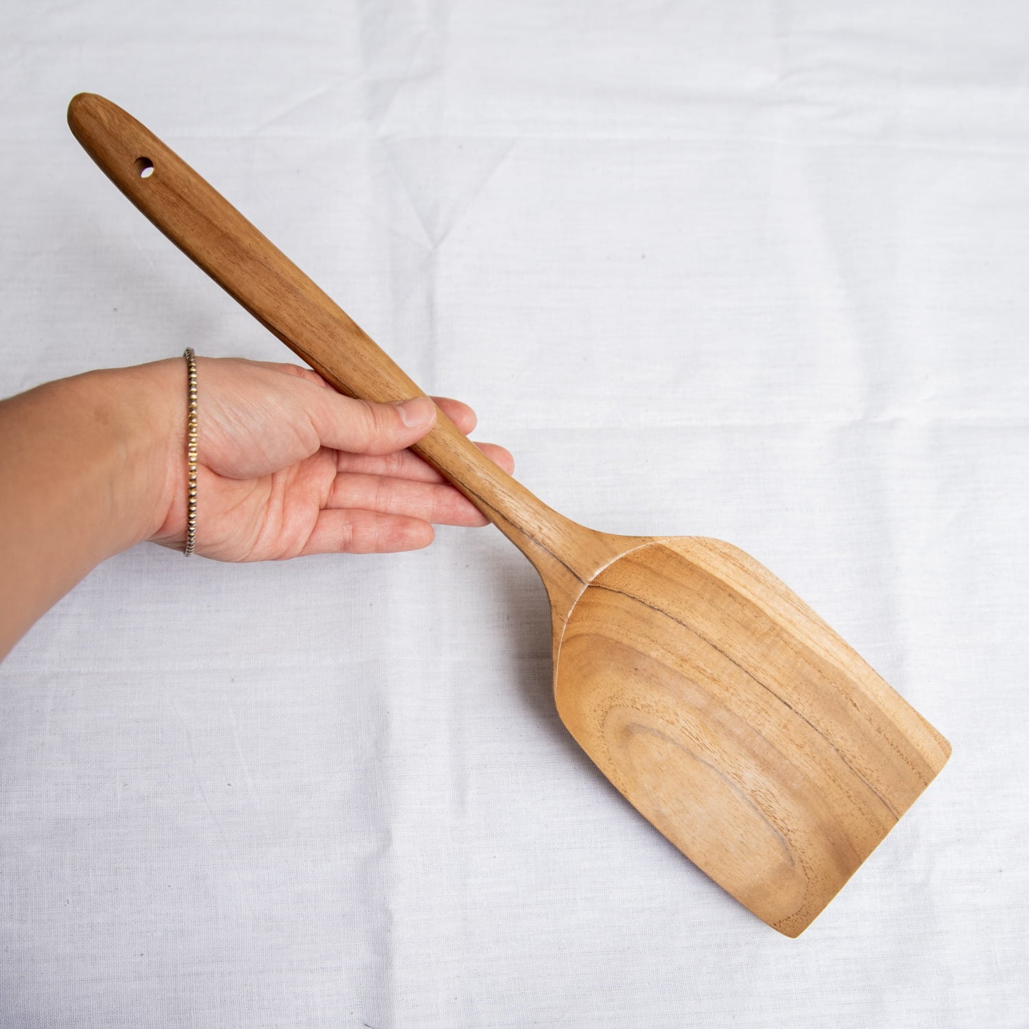 こちらのヘラは全長38cmにも渡る、本格的な大型サイズ。大鍋の端に掛けておいても中に落ちてしまわない、たっぷり大量調理にも向いた大きさです。お料理中の熱にも強く、便利で頑丈な木べらは幾つあってもいいものです。木製なので鍋肌を痛めることなく、しっかり混ぜ返す動きもできる、ベーシックなスクエア型です。