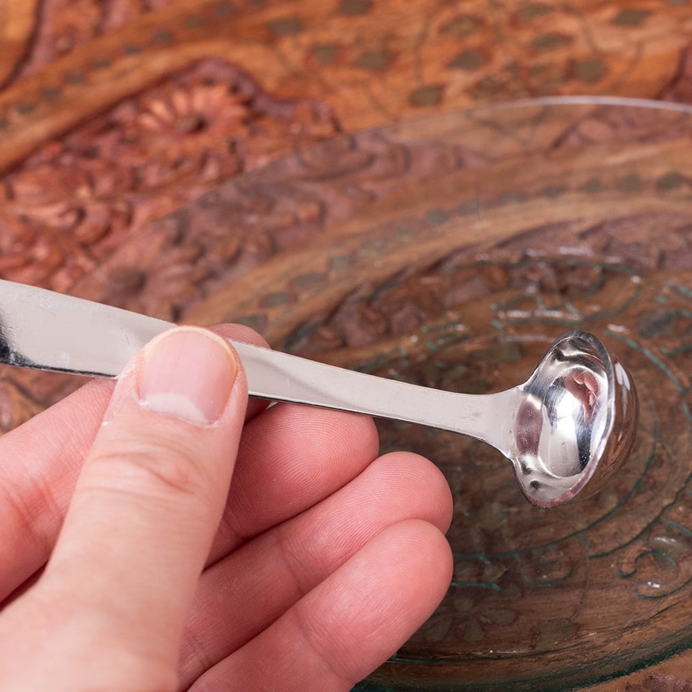 インドでオイルやギーなどをすくうのに使われている、小さくてかわいいレードルです。そのコンパクトなサイズながらも厚みがあり重厚感あるしっかりとした作りで、長く愛用できる実用性が魅力です。厚みのあるステンレス素材が生み出すどっしりとした安心感があります。このレードルは「テルパリ(Tel Pali)」と呼ばれ、インドではスパイスオイルやギーなどをすくうために日常的に使われています。他にも、砂糖、ナンプラー、チリパウダー、ソースなどをちょこっと移すのにおすすめ。コンパクトでありながら頼れるステンレスレードルです。
