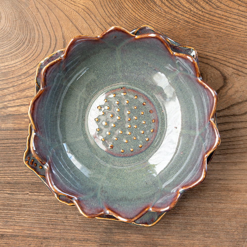 ずっしりと重量感のある、頑丈そうな器です。蓮の花弁が細やかに表現された内側のデザインもさることながら、飴色の地に青みがかった釉薬が流れるようにかかっており、見ていて飽きのこない素敵な色合いです。