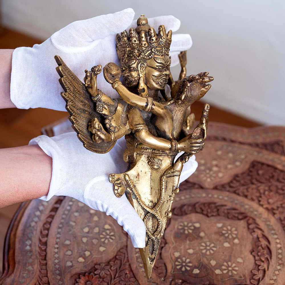 しっかりとしたサイズがあり、作りは本格的で、古来より仏像製作に使われてきたブラス製で作られているため、実際の重量より重厚感を感じられます。ブラスの輝きと細かく彫刻された細工にきっとご満足いただけると思います。| 素材 | ブラス |