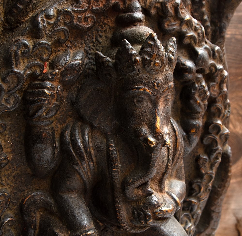 ガネーシャと言うと、金属のガネーシャが主流ですが、とても素敵な木彫りのガネーシャがネパールからやってきました。ネパールに在住する亡命チベット人の一家が制作したものです。時代を感じる黒、彼らにしかできないアンティークフィニッシングが素晴らしい、大変良くできている逸品です。