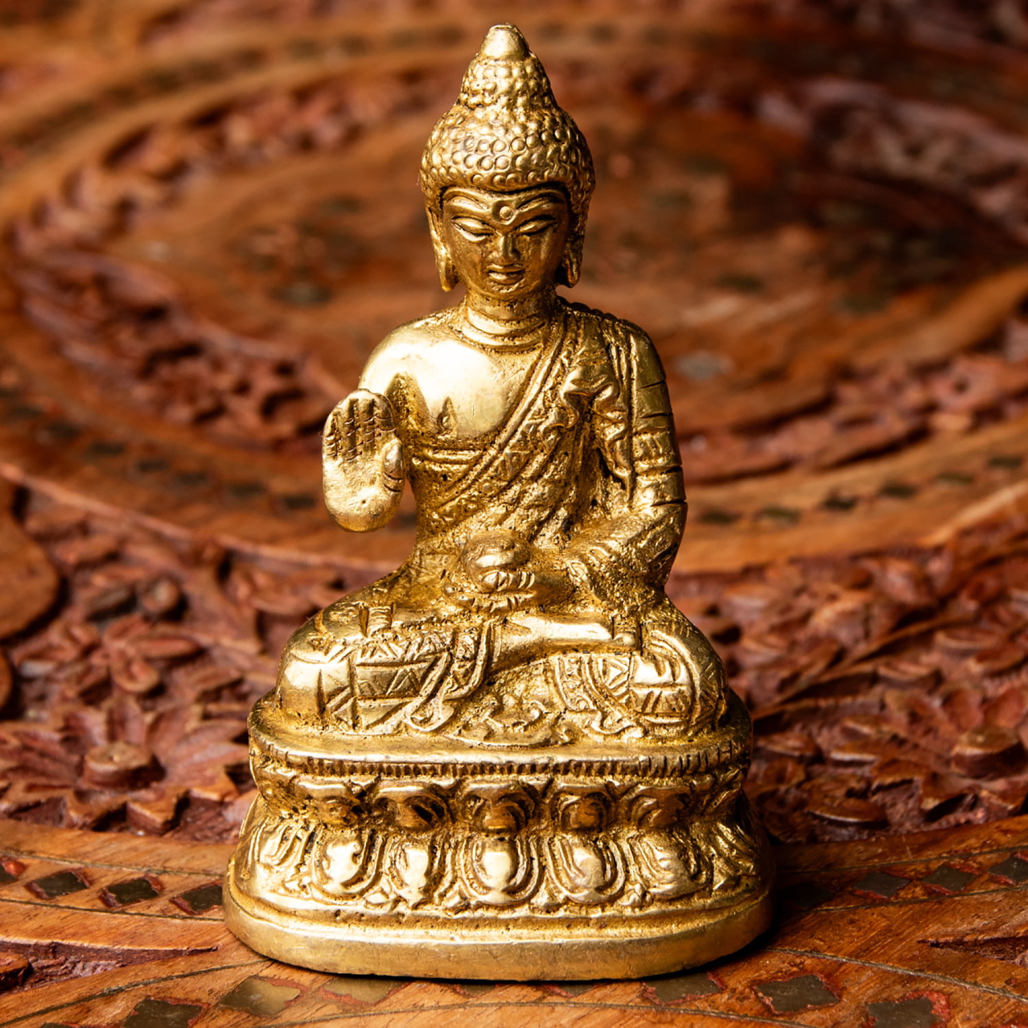 インドで伝統的な鋳造技法を用いてつくられた、ブラス(真鍮)製のブッダ像です。右手を上げた「アバヤ・ムドラー(畏れを除く印)」の姿は、見る人に安心感と穏やかさをもたらす象徴とされています。小ぶりながらも重量感があり、金属の質感や衣の繊細な彫り込みからは、職人の丁寧な手仕事が感じられます。仏壇や瞑想スペースはもちろん、書斎やリビングに置いても空間を静かに整えてくれる存在です。