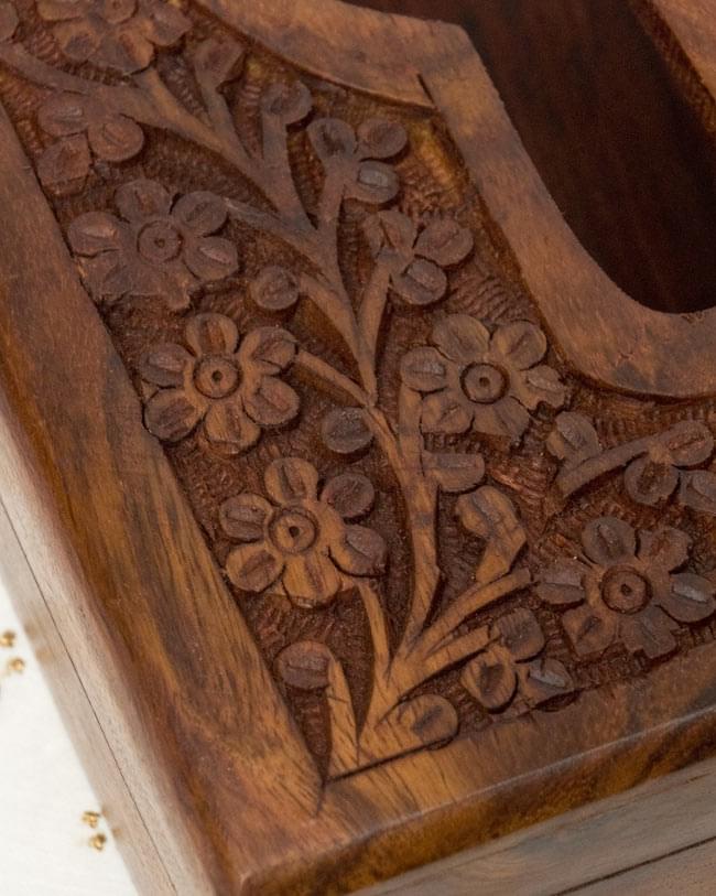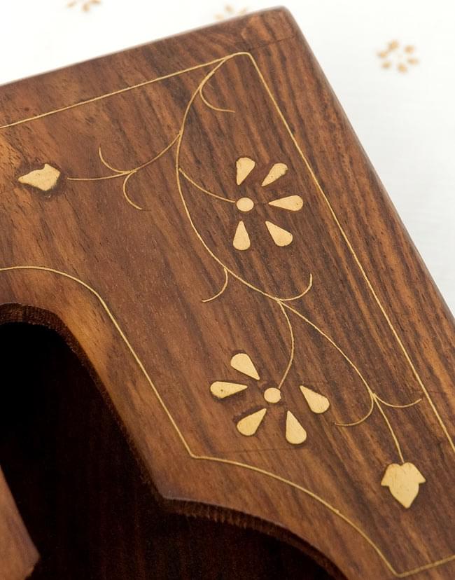 木に埋め込まれた綺麗な金属と、美しく細かな彫刻が魅力的なティッシュケースです。綺麗な木目と、細かな彫刻はとても高級感があり、アジアンなお部屋にはもちろん、インテリアとしてもシックに決まります。