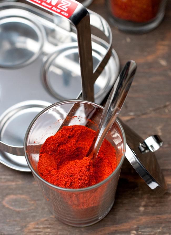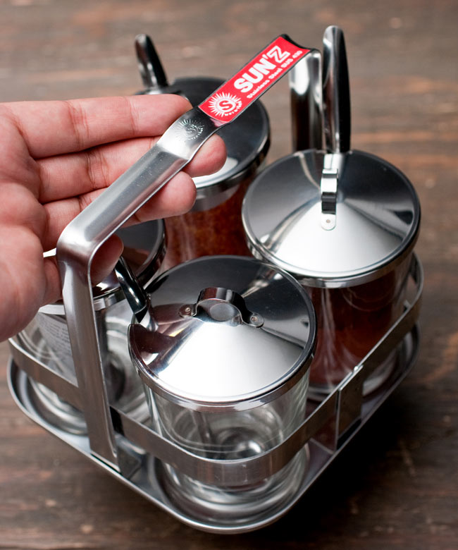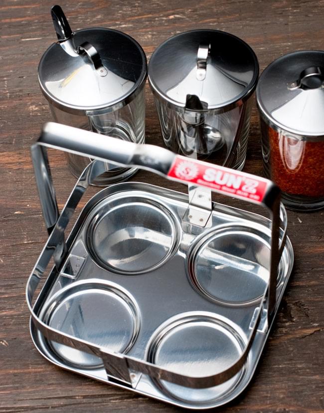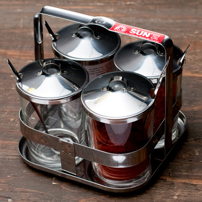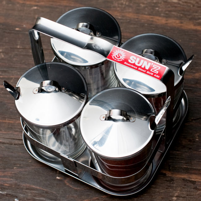 タイの屋台で食事をすると必ずテーブルの上に載っているステンレス製の薬味入れです。タイでは4つの入れ物の中に、砂糖、ナンプラー、唐辛子の酢漬け、粉末赤唐辛子を入れて使用しています。トレーの上に容器が4つ載っています。トレーごとまとめて移動できるのでとっても便利!