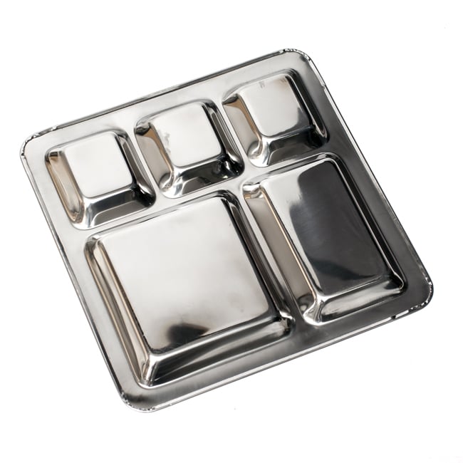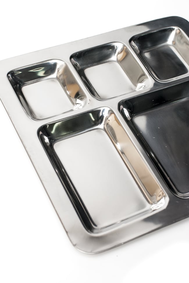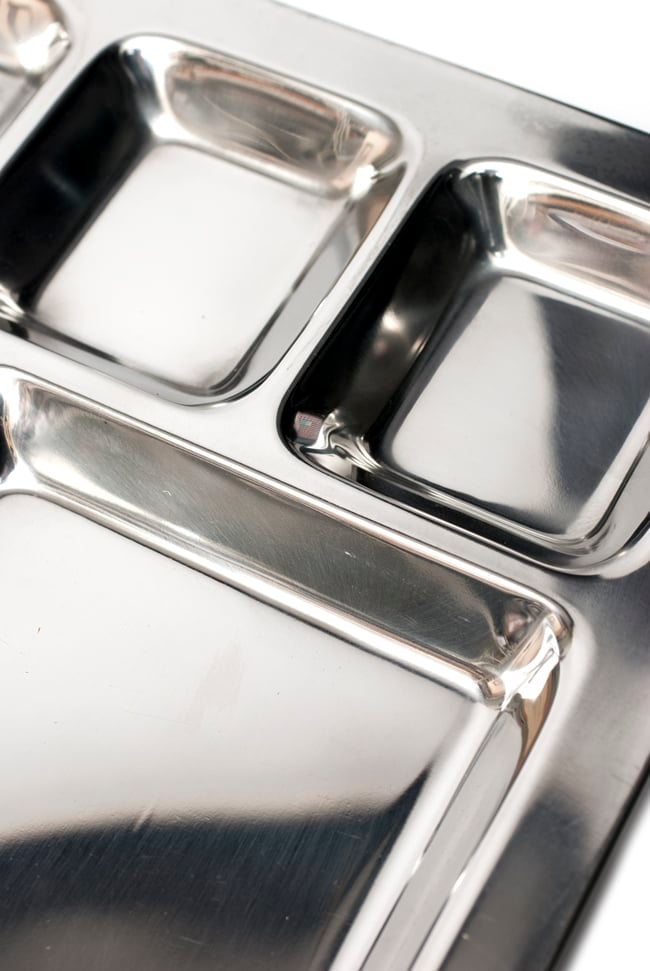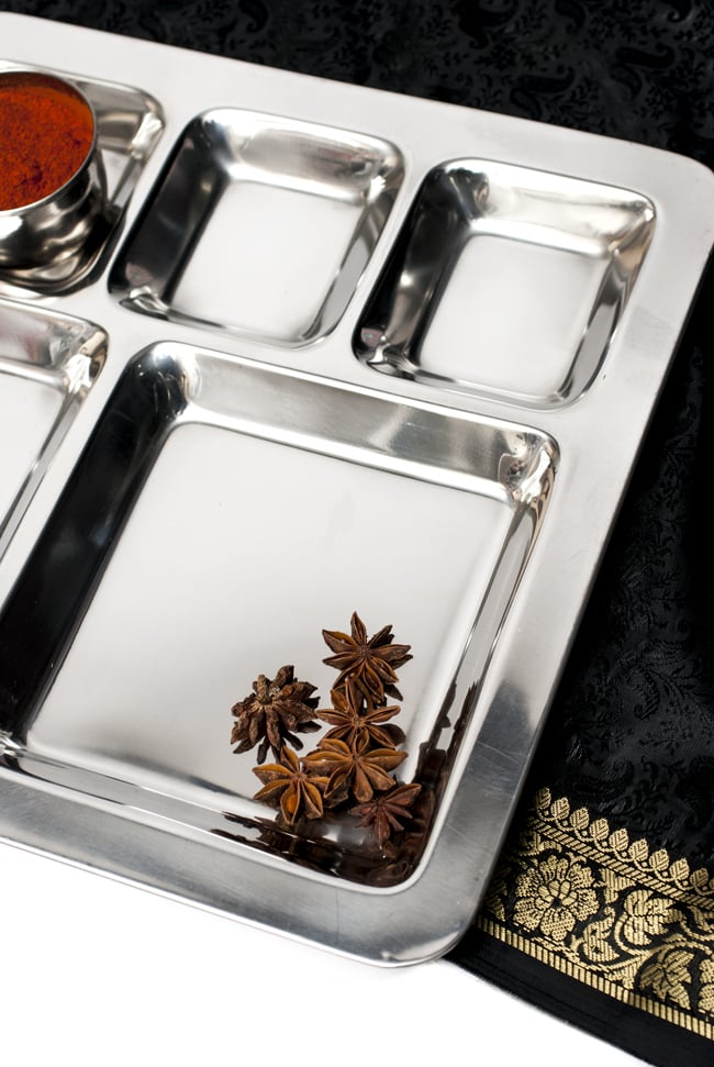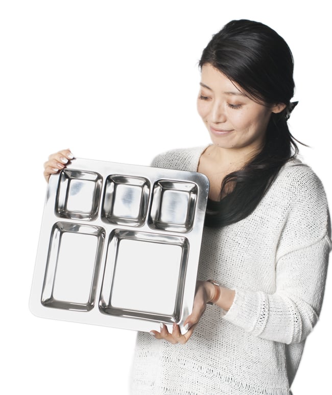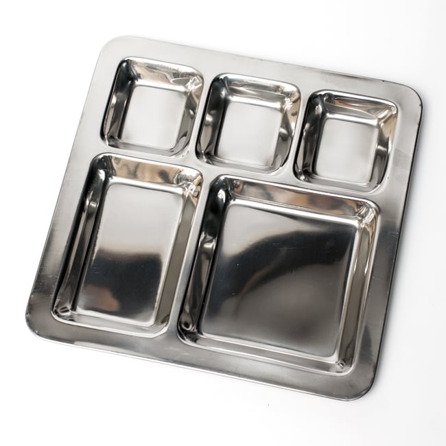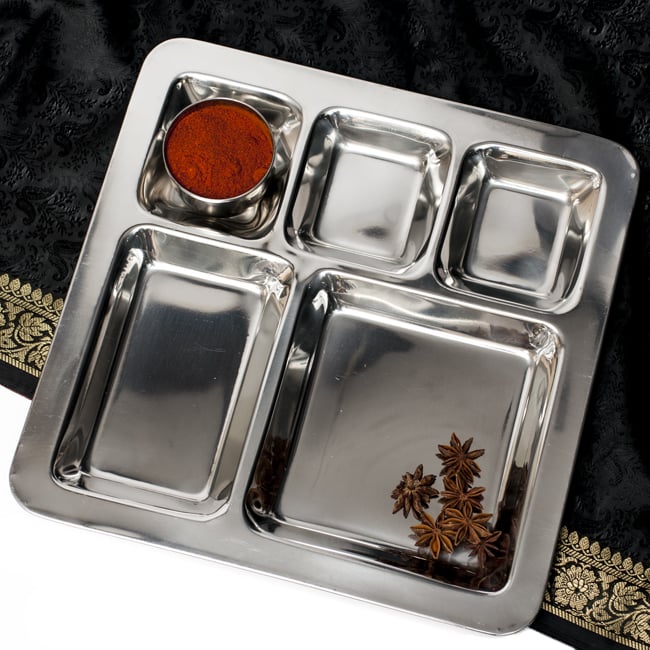 インドのレストランや家庭で広く使われているステンレス製のランチプレート。丈夫で長持ち、重厚感あるステンレス製ですので長くお使いいただけます。一つ一つの仕切りは多少深さもあるのでインド風にカレーを入れてもいいですし、普通のランチプレートとして色々なお惣菜を入れてもいいですね。大きなスペースにはチャパティやご飯、小さなスペースにはカレーや炒めものなど、どんあ盛り付けにするか考えるだけでもワクワクしてきますね!すごく小さなスペースにはチャトニやアチャールを載せるのが楽しそうです。もちろん重ねて収納できますので、食器棚のジャマにもなりません。