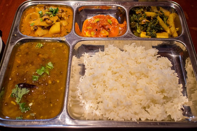 大きな部分にはご飯やチャパティを、小さなくぼみにはカレーやおかずを入れて。