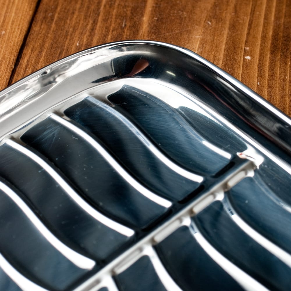 こちらの食器は、そんなバナナの葉っぱをモチーフにしたステンレス食器です。南インドで用いられているバナナの葉と、北インドで一般的に使われているステンレス食器。それぞれの魅力を融合したような製品です。