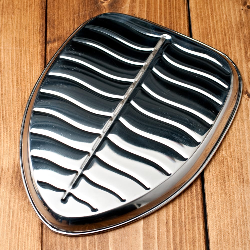 インドのステンレス製 バナナリーフプレート[約22.5cm]の商品写真 1枚目 バナナリーフの形をした、ステンレス製の珍しい食器です。南インド料理はもちろん、さまざまな料理へオススメです!