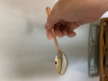 インドでの食事というと、あまりスプーンを使わないというイメージがあるかもしれないのですが、実は色々な場面で使われています。インドのインド料理店でも高級店で使っているスプーンがこちら。ステンレスのスプーンにカッパー加工が施され、重量感と高級感がある特別なスプーンです。落ち着いた銅の色合いに槌目がさまざまな光を反射して、眺めているだけでもうっとりしてくるきれいな一品です。