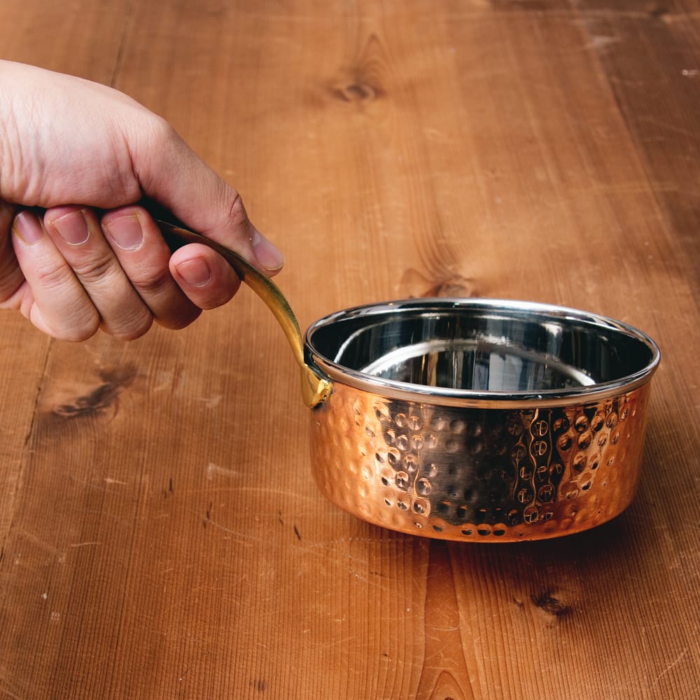 銅装飾が施された美しい片手鍋です。内側は重厚なステンレス、外側は熱伝導率の高い銅を用いたハイブリッドなソースパン。更に槌目で美しく模様を彩った、グレードの高い仕上がりです。毎日使う台所道具だからこそ美しい物を揃えたいという人にぴったりのキッチンウェアですね。持ち手部分も、美しい曲線を描いています。エネルギッシュでカオスな印象のあるインドの、いつもとは少し違う側面を見せてくれる高級な一品です。