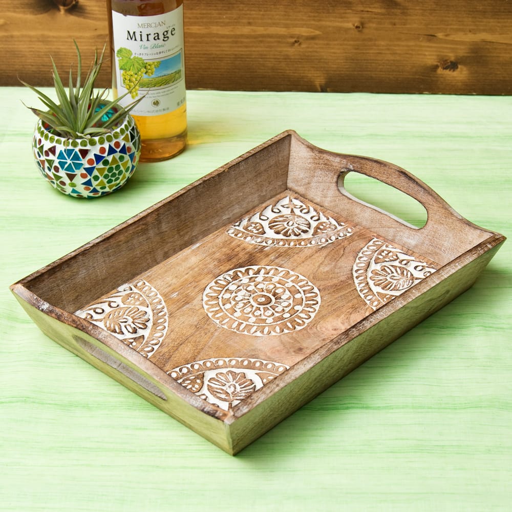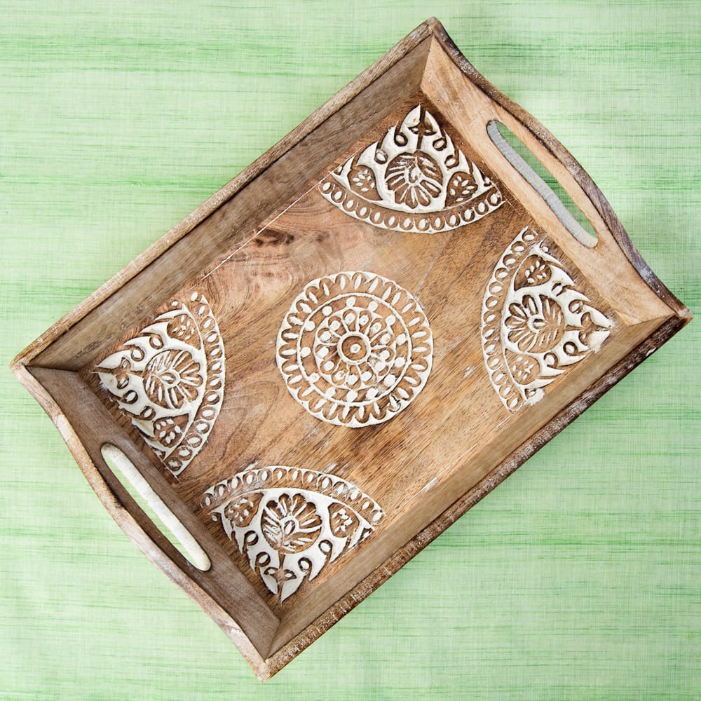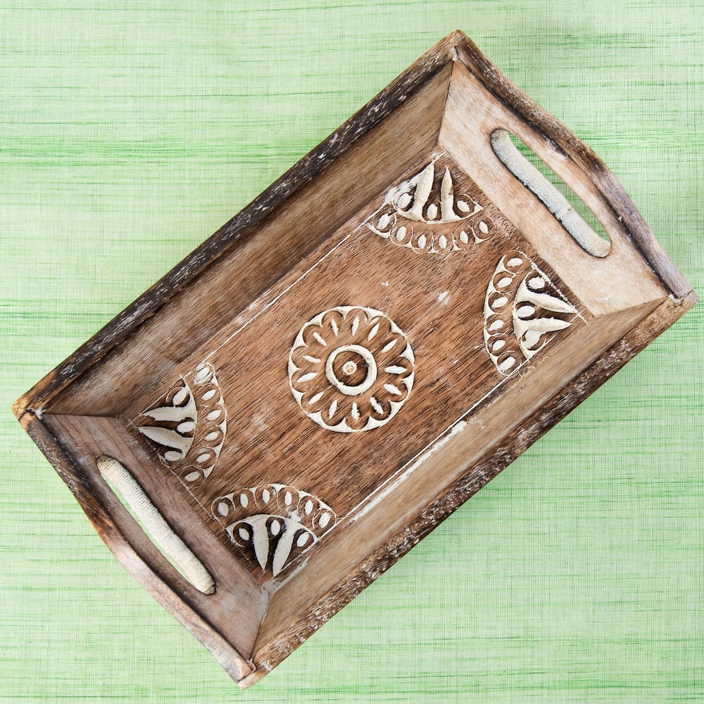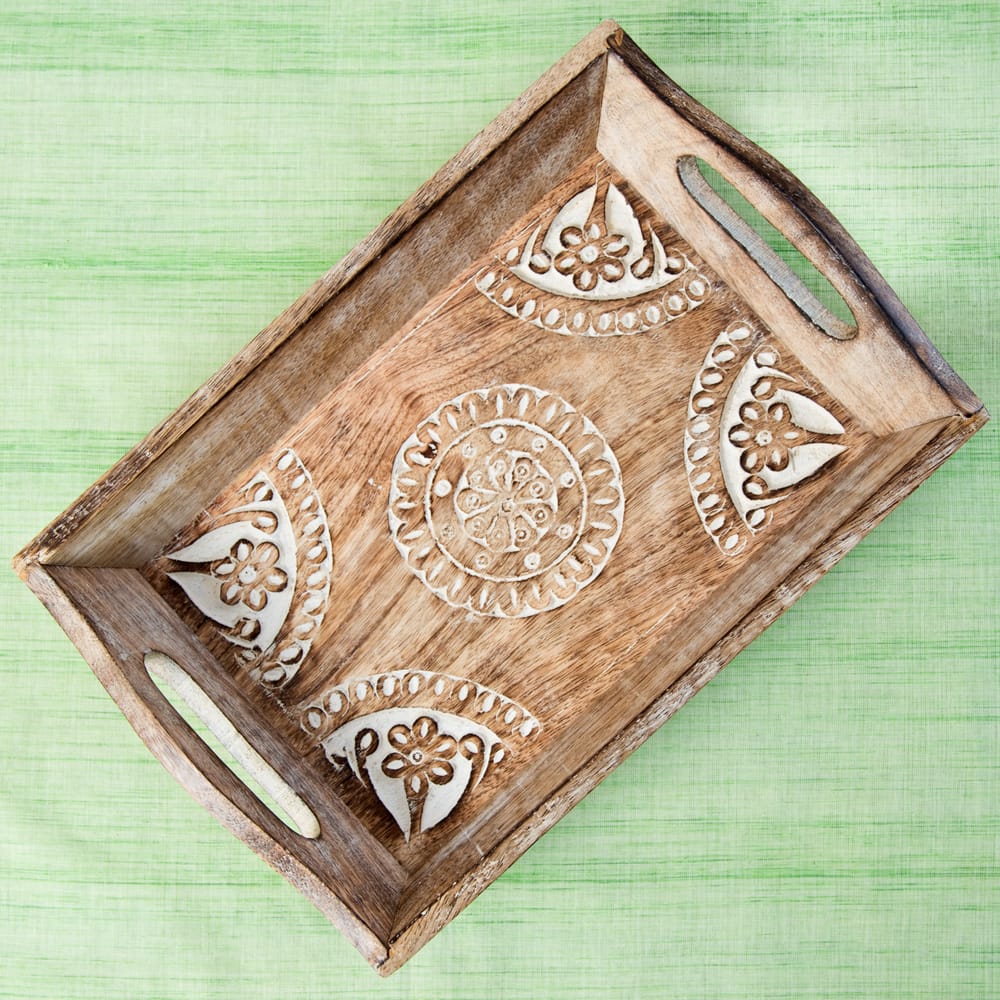 インドの大都市デリーの雑踏のなかで見つけたウッドトレーが入荷しました。 職人の手仕事による味わいのある彫り模様と、底面の歪みやバリ等が少ない丁寧な作りで暖かさの中にも確かな技術を感じさせます。手彫りの模様にホワイトで味付けを施し、素朴ながらもアクセントある仕上がりに。 日々の暮らしを彩るのにぴったりの一品です。