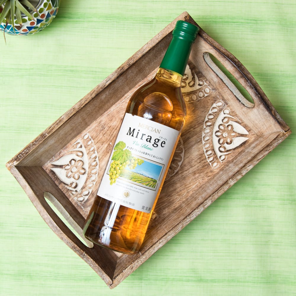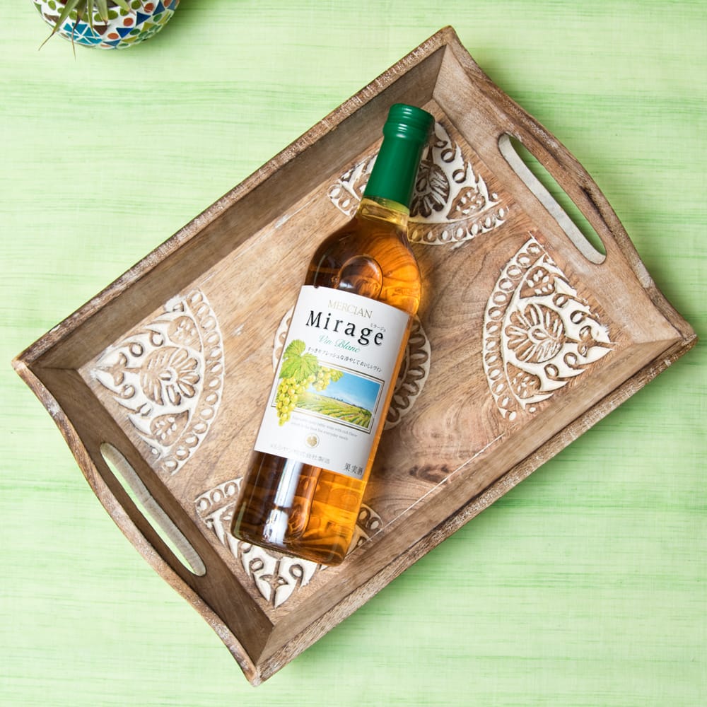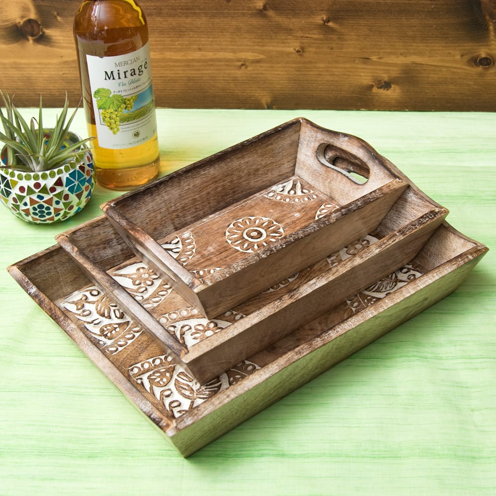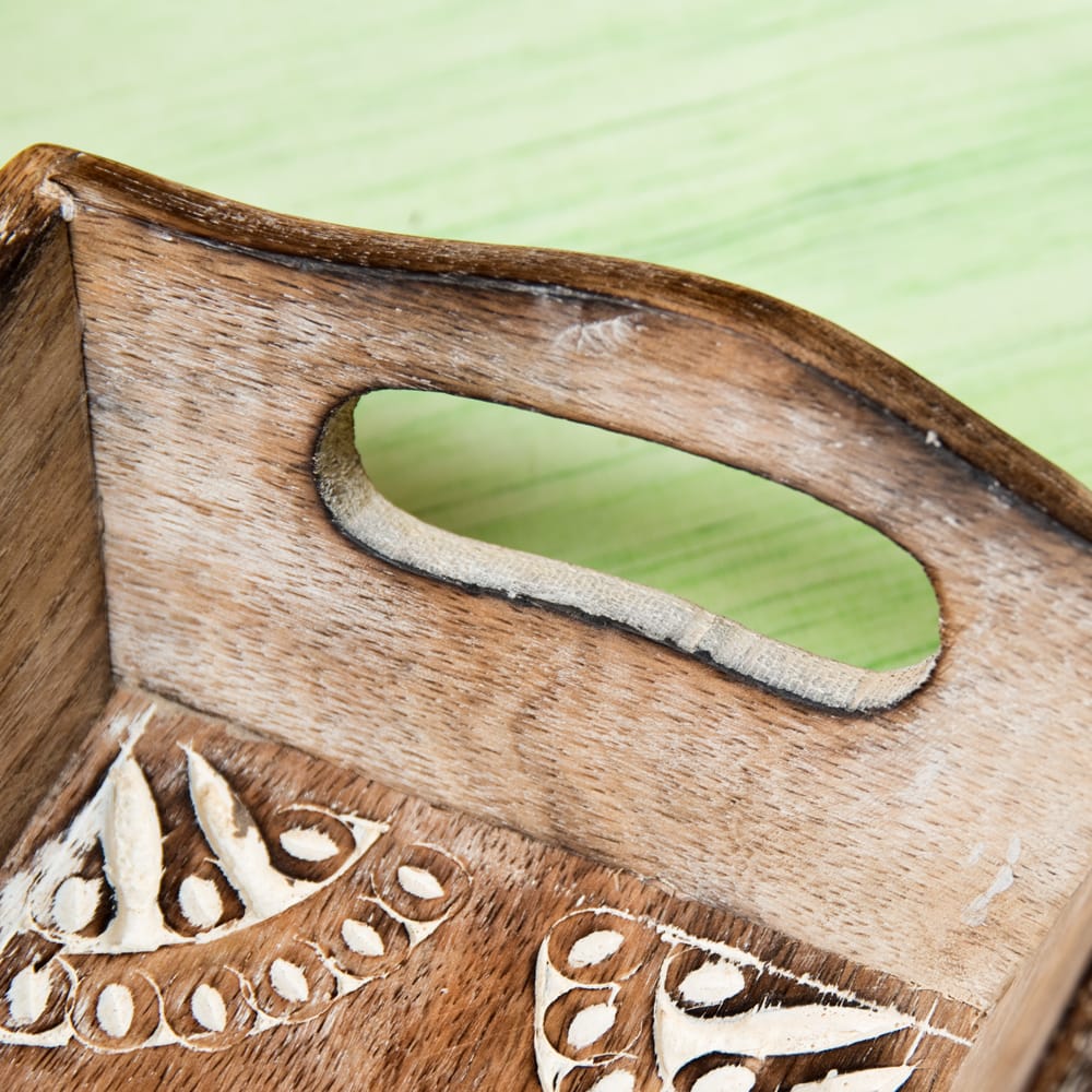 インドの大都市デリーの雑踏のなかで見つけたウッドトレーが入荷しました。 職人の手仕事による味わいのある彫り模様と、底面の歪みやバリ等が少ない丁寧な作りで暖かさの中にも確かな技術を感じさせます。手彫りの模様にホワイトで味付けを施し、素朴ながらもアクセントある仕上がりに。 日々の暮らしを彩るのにぴったりの一品です。