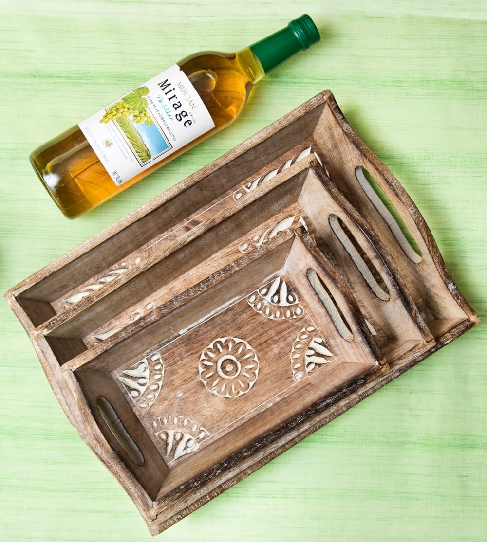 素敵な曼荼羅柄が彫り込まれた木製のお盆。見た目が気に入って購入しました。3サイズセットでお得に買えたのもうれしいところでした。小さめサイズでふちが高いので取り回しはしやすいです。一番大きなものはお盆として、後の2つは小物入れとして使っています。