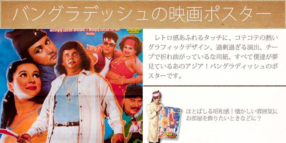 濃いオヤジ!! 泣いてるサリーの女性! 手に剣を持った悪漢が迫る! レトロ感あふれるタッチに、コテコテの熱いグラフィックデザイン、過剰過ぎる演出、チープで折れ曲がっているな用紙、すべて僕達が夢見ているあのアジア!娯楽の王道を一直線に突っ走るバングラ映画のポスターが限定入荷しました!! もちろん、ほぼ一点物。再入荷の予定は全くありません。 バングラデッシュの現地買い商品ですので、端っこは折れ曲がっていますし、ちょっと破れている場合もあります。紙質もペラペラです。でも、これが本物なのです。アジアだ! これがバングラデッシュだ!! アジアの本質をわかり、このポスターの価値がわかるアジア好き、サブカル好き、レア物好きだけに買って行っていただければと思います。 |