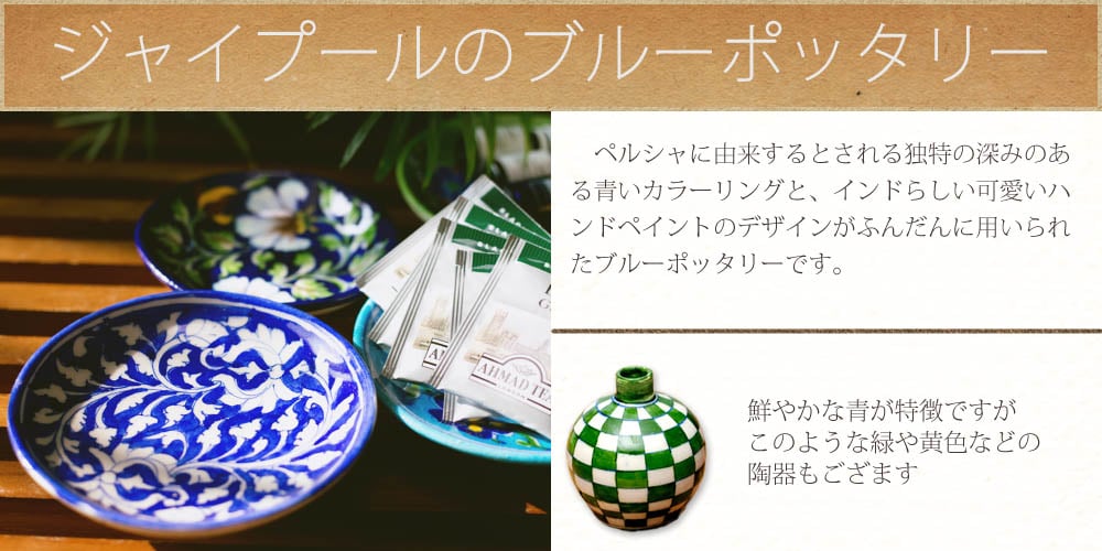 デリーから南西に250kmほど離れたところにある都市・ジャイプールは幅広い手工芸品で有名ですが、その中でも特に知られているのがブルーポッタリー(青陶器)です。ペルシャに由来するとされる独特の深みのある青いカラーリングと、インドらしい可愛いハンドペイントのデザインがふんだんに用いられた雑貨は非常に魅力的なものが数多くあります。 |