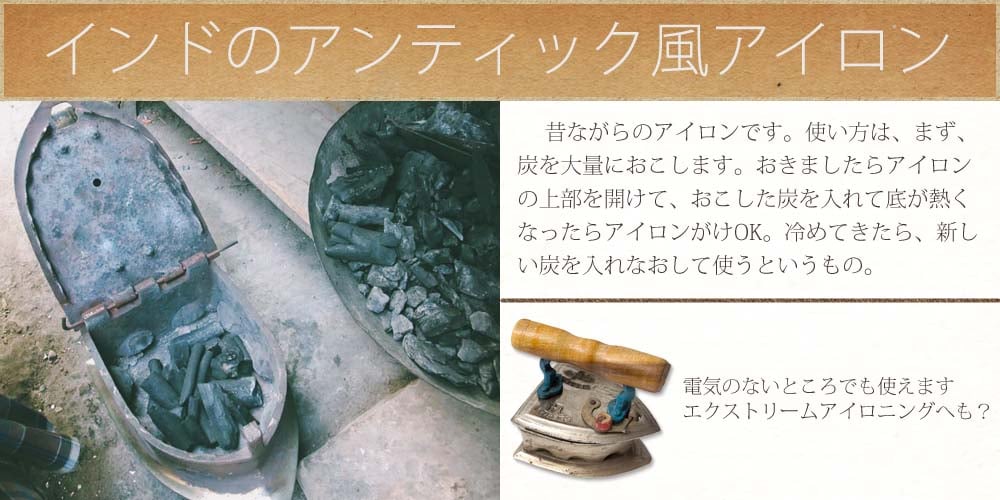 えーインドって、こんなアイロンまだ使ってるんですか〜?はい、一般的に実用されているんですよ!! 使い方は、まず、炭を大量におこします。おきましたらアイロンの上部を開けて、おこした炭を入れて底が熱くなったらアイロンがけOK。冷めてきたら、新しい炭を入れなおして使うというもの。 昔の日本でも同じようなアイロンがありました。電気の安定しないインドでは、今でも街中のクリーニング店等で使われているのです。 こちらのアイロンも実際インドの人達が使っているものを買い付けてきました。重いアイロンを扱うのも炭の交換など扱いが大変ですが、実際に使える実用品です。あなたの家にも一台いかがでしょうか?もちろん、インテリアとしてもバッチリですよ。 |