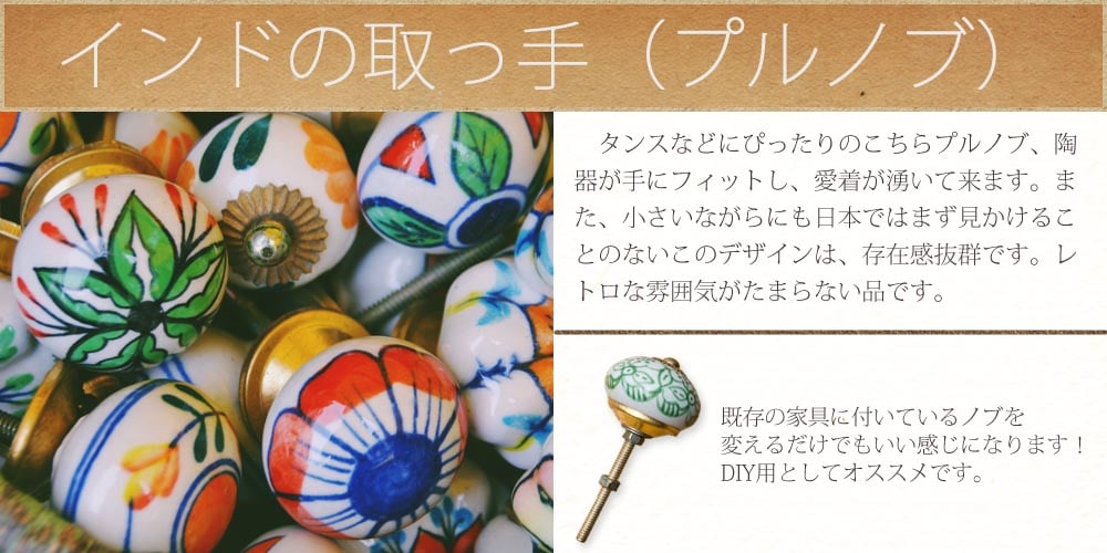 アンティーク模様入りの陶器が素敵なアジアンな取っ手(プルノブ)。陶器ならではの美しさが魅力的な一品です。ぜひ、お気に入りのデザインのものを、家具の引き出しや扉などにお取り付け下さいませ。 |
