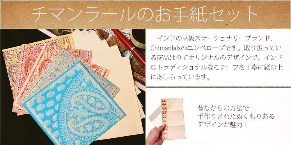 インドならではのデザインが美しい封筒。現地ではハイクラス向けに販売されており、その高品質さが魅力的です。 |