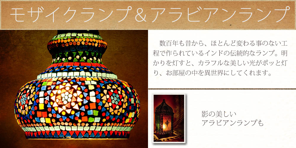 色とりどりに装飾されたアラビアンランプ。モザイクランプが光で本体の柄を美しくみせるものなら、こちらは周囲に綺麗な柄を浮かびあがらせるタイプ。 暗闇の中でクリアタイプの電球を点けると、ランプの柄が壁や天井に浮かびあがり、ゴージャスな雰囲気を演出します。 |