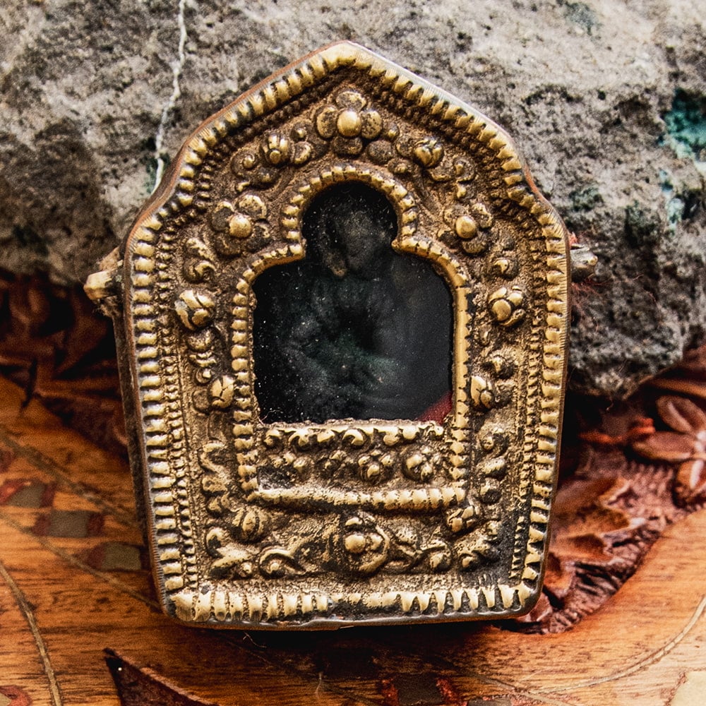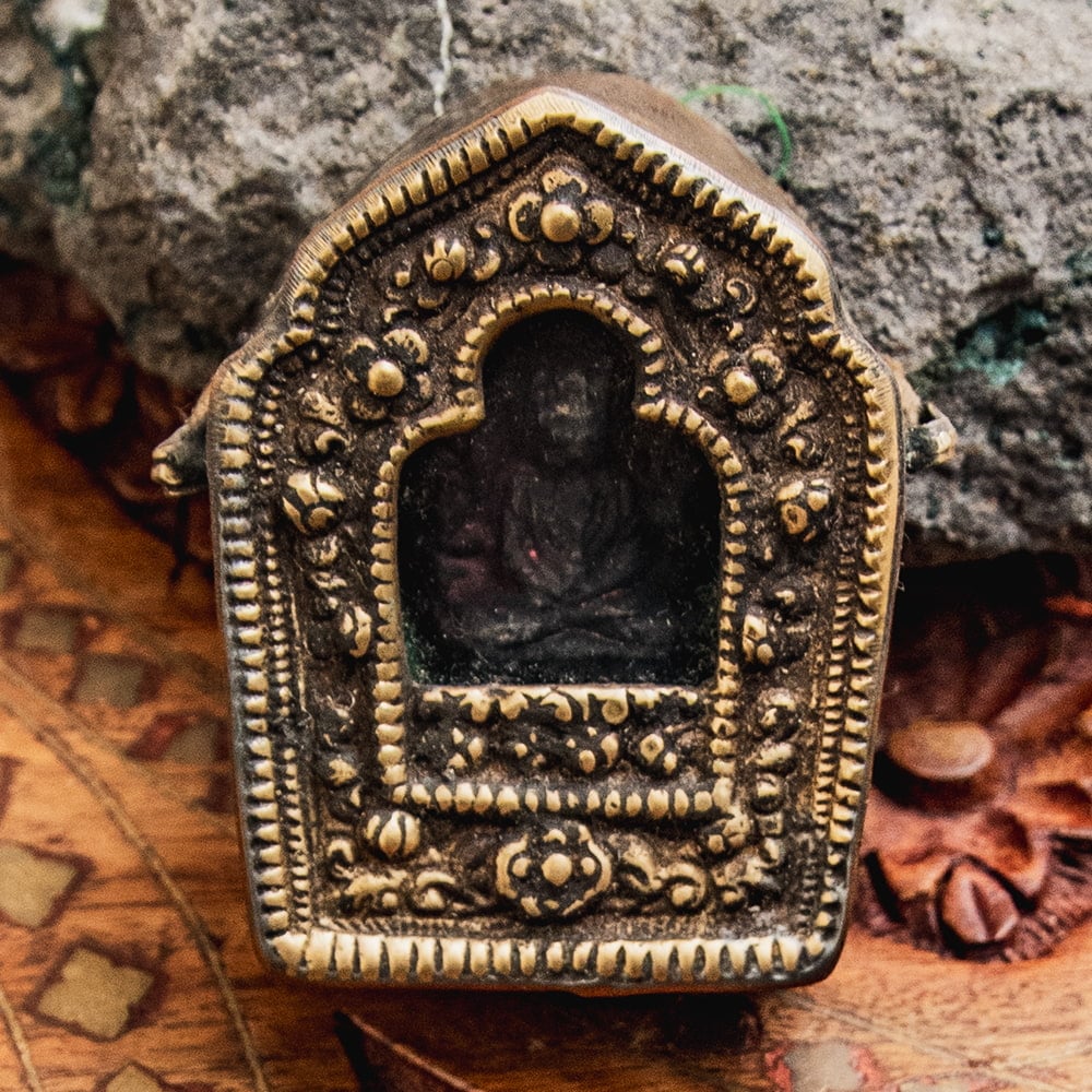 これは携帯できる祭壇ガウといいます。チベット、ネパール、ブータン、インドなどの仏教徒の間ではメジャーなものます。日本では仏具店でもあまりお目にかかることが出来ません、ちなみに日本では厨子(ずし)のひとつとして扱われます。この仏具の役割は2つあります。ひとつは「どこでもお祈りができること」、そして「お守り」として使えるということ。先程述べた仏教徒の間では家の大きな仏壇に供えたり、旅先に出かける時に心臓に近い部分に帯などで括り使われます。また災厄を退けると考えられています。とてもわかりやすく言うと、キリスト教の十字架と日本のお守りをかけ合わせたものでしょうか。