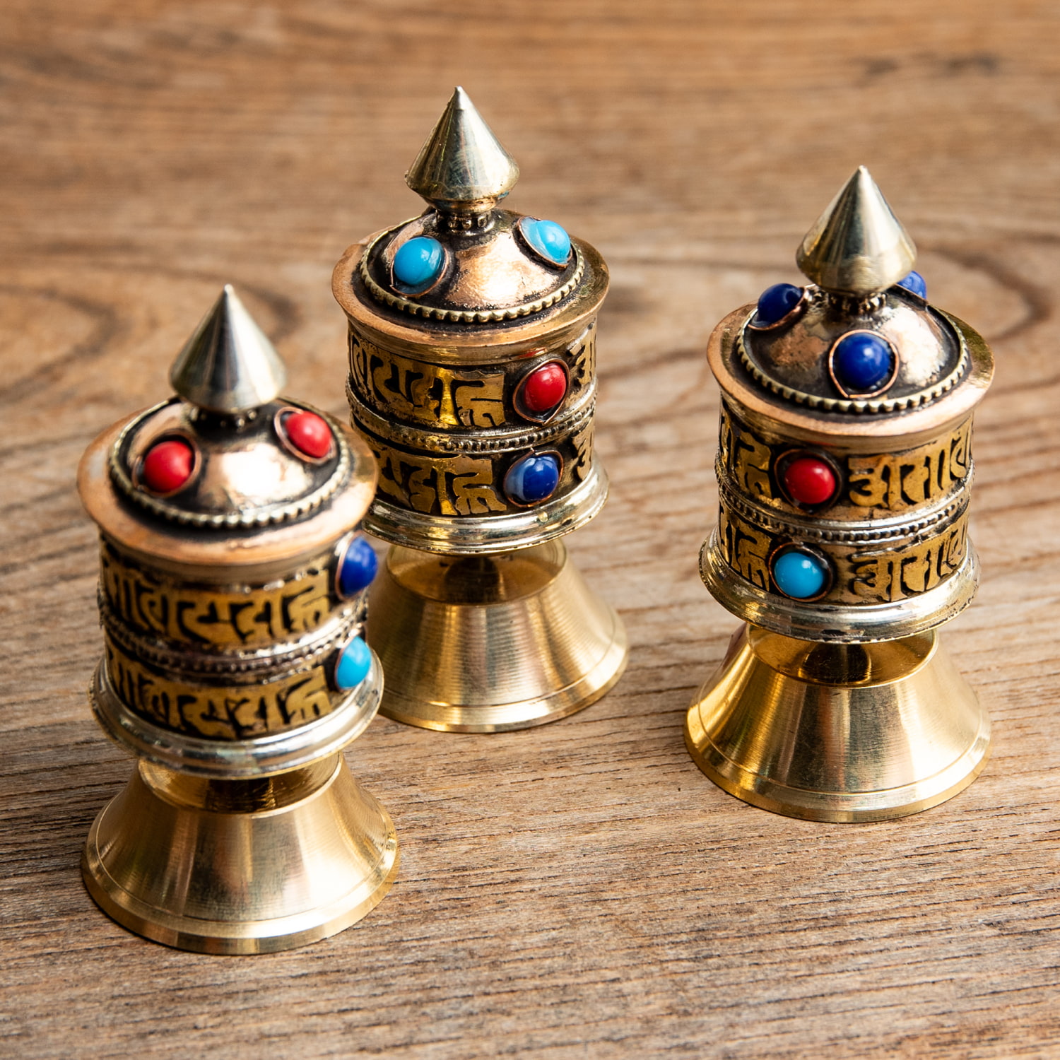 こちらは、1個のマニ車がついた卓上タイプ。マニ車の側面のマントラも美しく、インテリアとしてもお使いいただけます。
