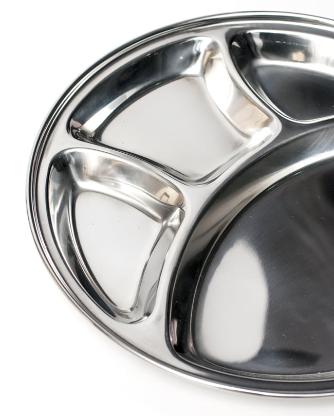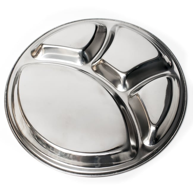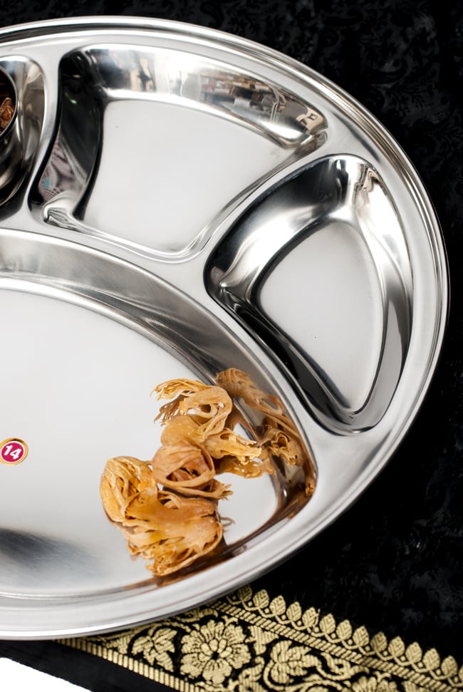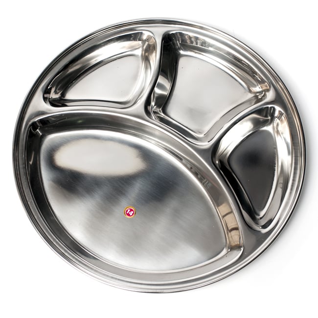 インドで作られ、使われているステンレス製のランチプレートです。小学校の頃、給食でこんな食器を使った方も多いのではないでしょうか? なんだか懐かしい感じですが、インドではまだまだ現役です。一番大きな部分にご飯やチャパティーを入れ、小さなところにはカレーやヨーグルトなどを入れて使用します。深さもあるのでインド風にカレーを入れてもいいですし、普通のランチプレートとしても使いやすいです。同じお皿であれば重ねて収納できますので、食器棚のジャマにもなりません。
