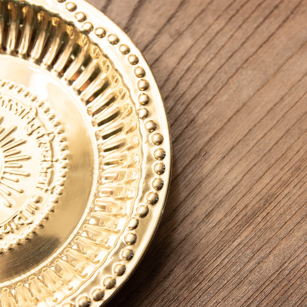こちらの商品はアルミにブラス風のメッキを施したものです。ブラスよりも軽くて取り回しやすくなっています。渋みのある輝きをもつブラスカラーの食器はインドで広く普及しており、宗教的な場所などでもよく使われています。