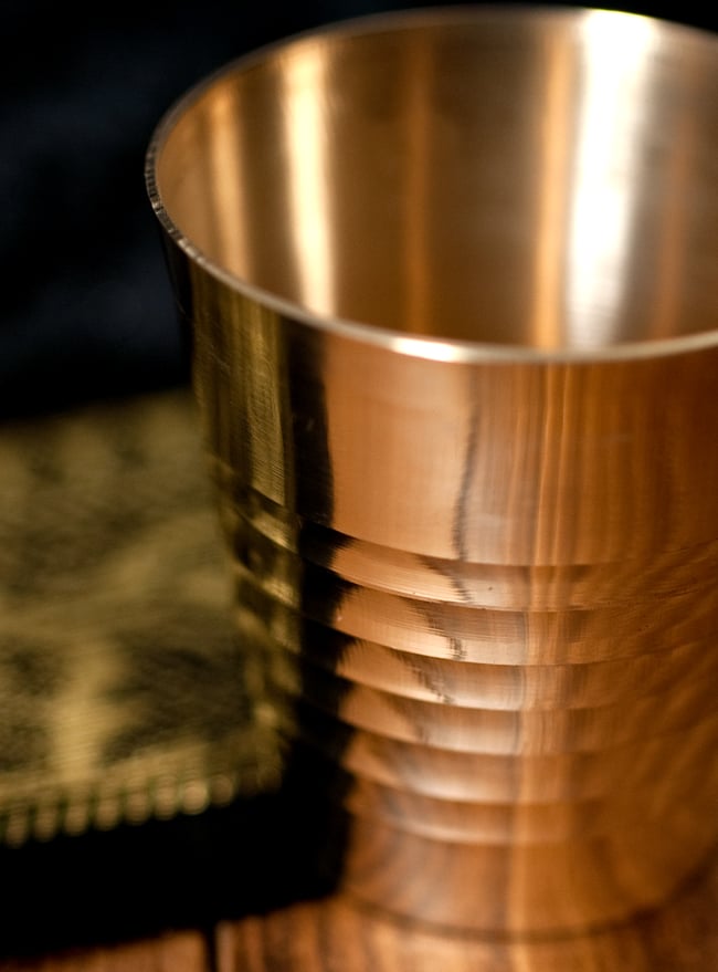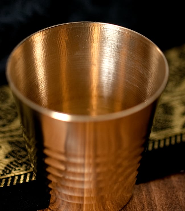 インド現地では礼拝を行う時にガンジス河の水を入れたり、神様への捧げ物の容器として主に使用されるブラスのカップです。古来よりインドではブラスは高級な金属とされ、仏像を作るのに使われたり、宗教用品にはほぼ必ず銅か、ブラスが使われてきました。手のひらに収まる小ぶりな、かわいらしいサイズ感のブラスカップ。模様として入っている横ラインは持つときの滑り止めにもなり、見た目の美しさと実用性を兼ねています。