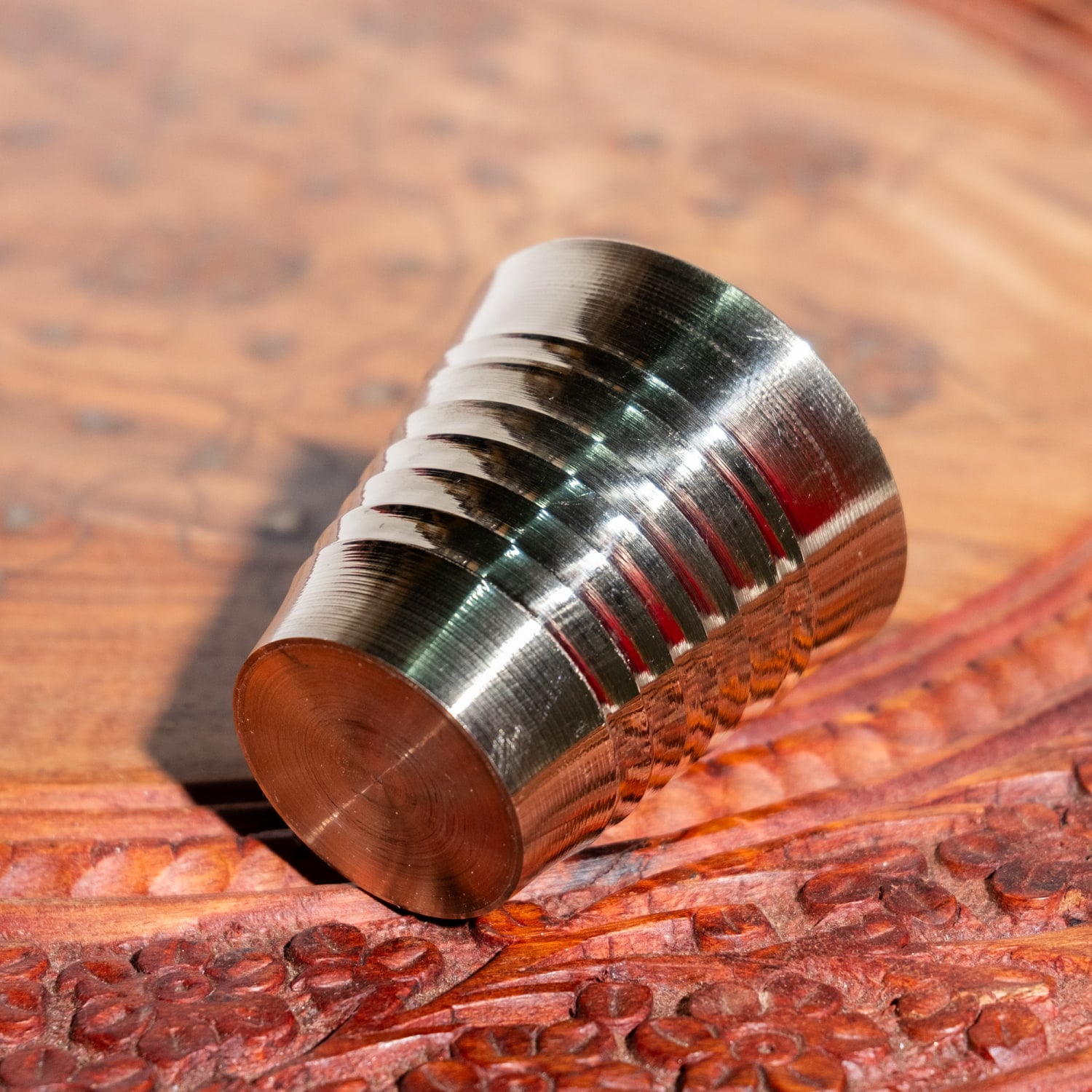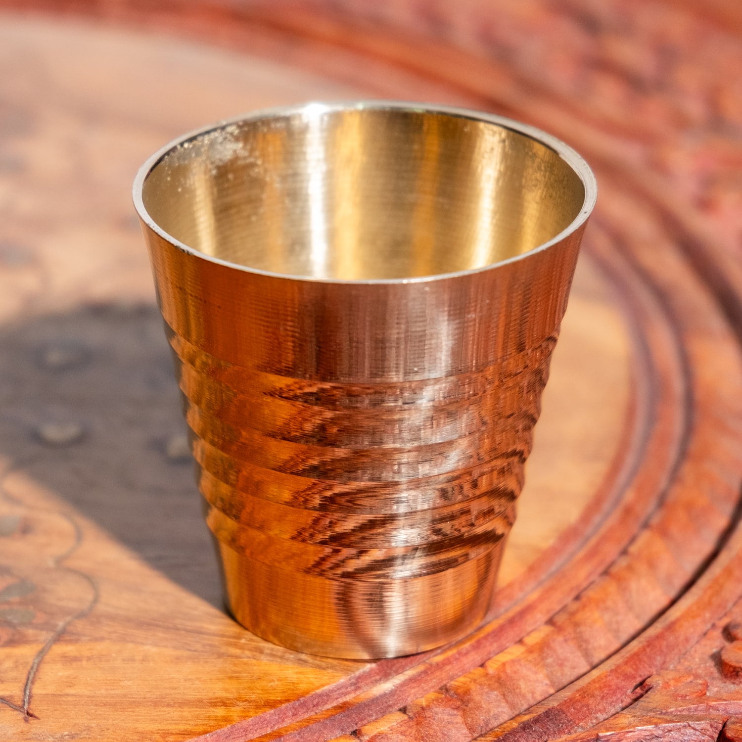 インド現地では礼拝を行う時にガンジス河の水を入れたり、神様への捧げ物の容器として主に使用されるブラスのカップです。古来よりインドではブラスは高級な金属とされ、仏像を作るのに使われたり、宗教用品にはほぼ必ず銅か、ブラスが使われてきました。手のひらに収まる小ぶりな、かわいらしいサイズ感のブラスカップ。模様として入っている横ラインは持つときの滑り止めにもなり、見た目の美しさと実用性を兼ねています。