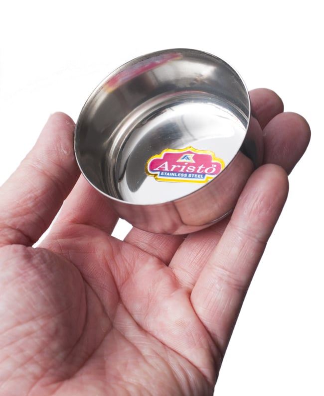 インドでカレーを食べるときに使うステンレス製の小皿。小皿の中にカレーやヨーグルトを入れて食べますが、薬味や調味料を入れておくのにも便利です。色々なサイズを取り揃えましたので、用途に合わせてお選びください。こちらは少し小さめサイズのカトリです。ラッサムなど、たくさんは食べないような汁物などを盛りつけてみると楽しいかもしれませんね。イメージとして料理名付きでネーミングしてみましたが、もちろんお好みの使い方ができます。