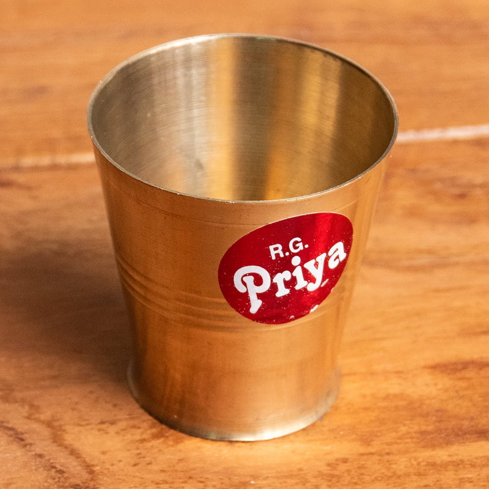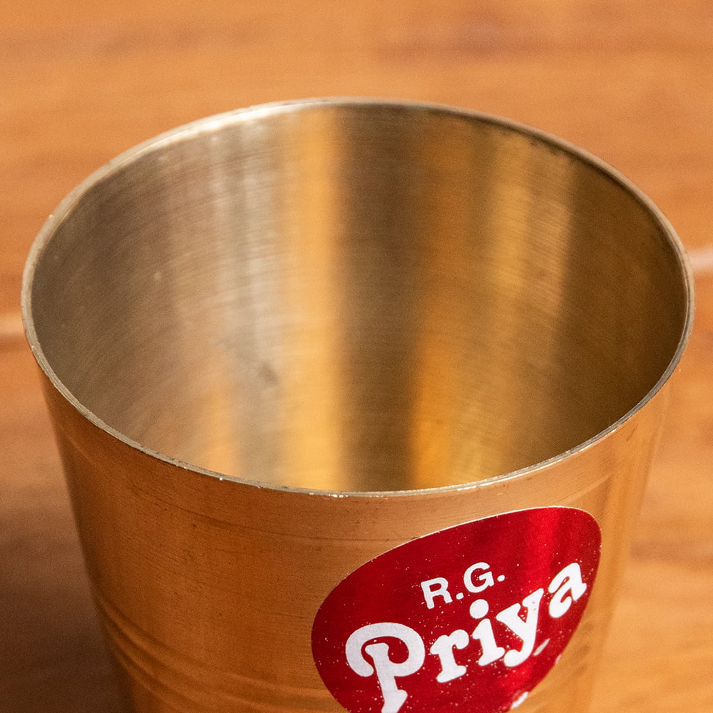 インド現地では礼拝を行う時にガンジス河の水を入れたり、神様への捧げ物の容器として主に使用されるブラスのカップです。古来よりインドではブラスは高級な金属とされ、仏像を作るのに使われたり、宗教用品にはほぼ必ず銅か、ブラスが使われてきました。手のひらに収まる小ぶりな、かわいらしいサイズ感のブラスカップ。模様として入っている横ラインは持つときの滑り止めにもなり、見た目の美しさと実用性を兼ねています。