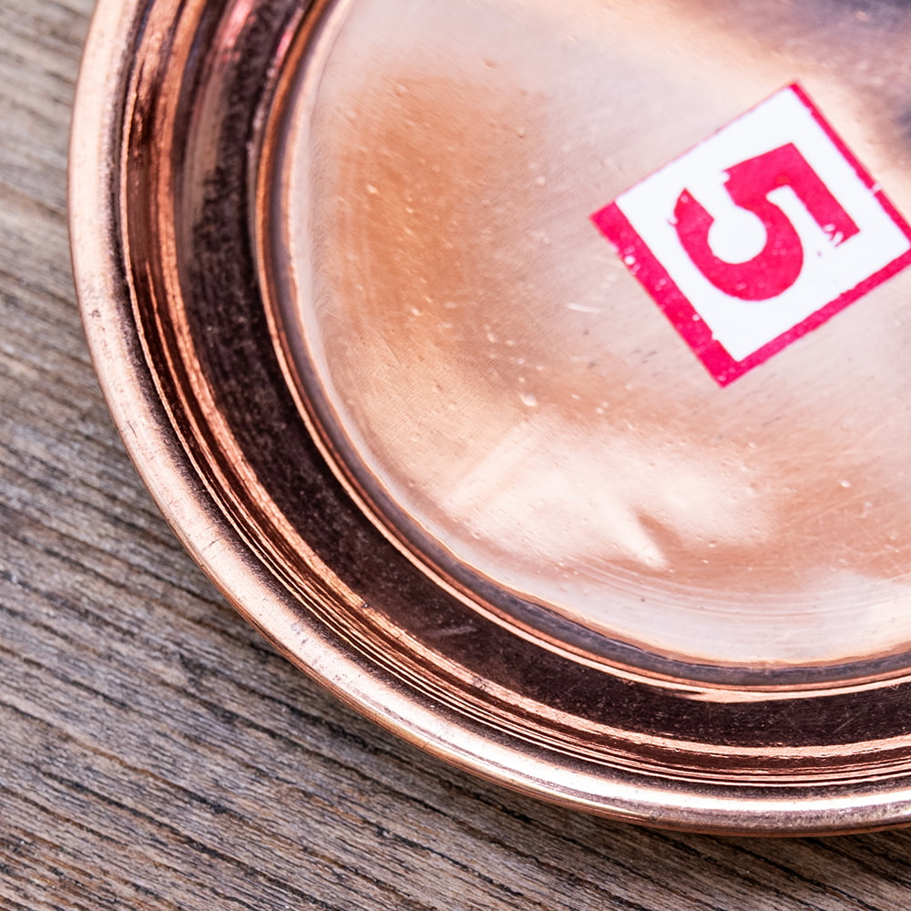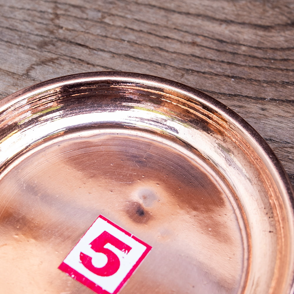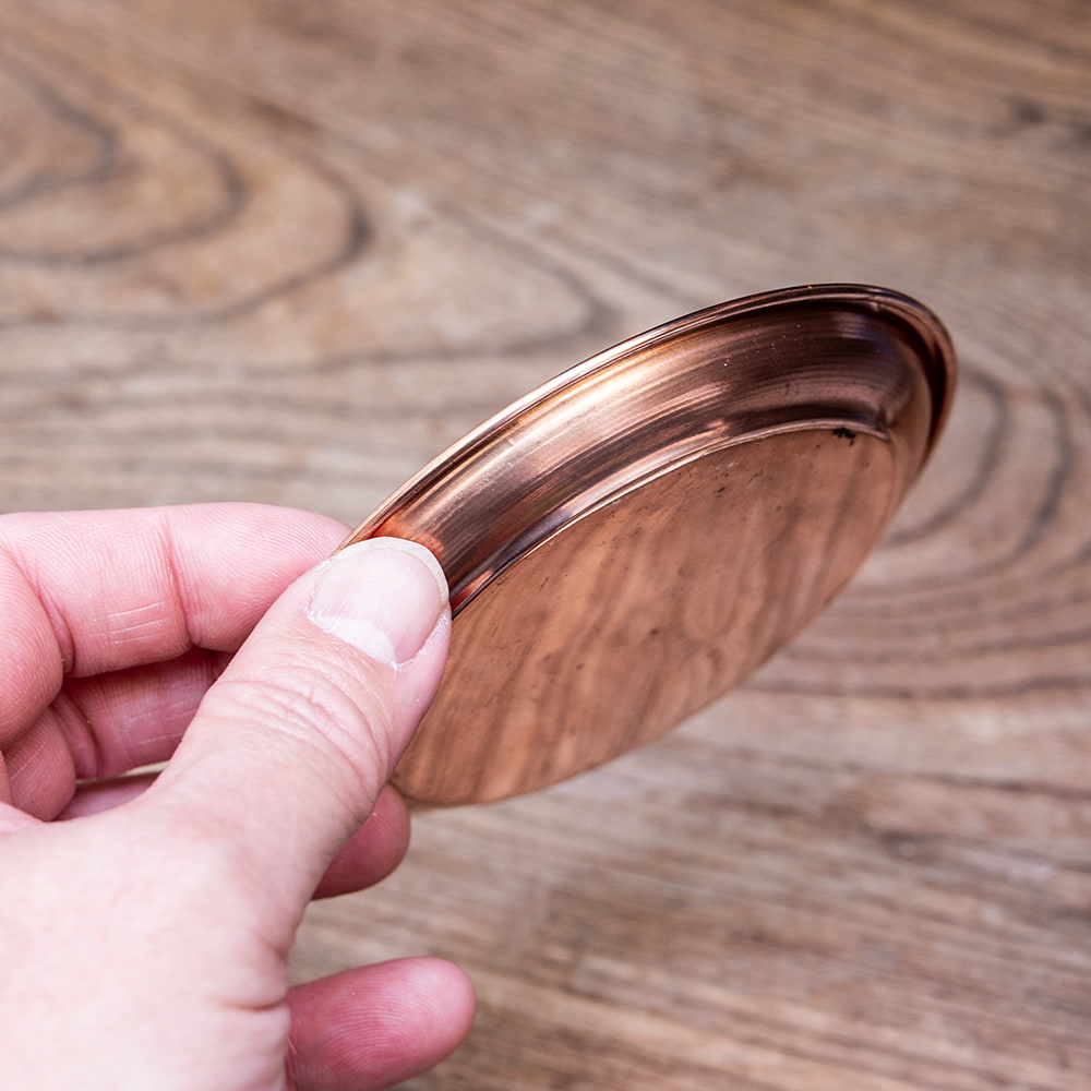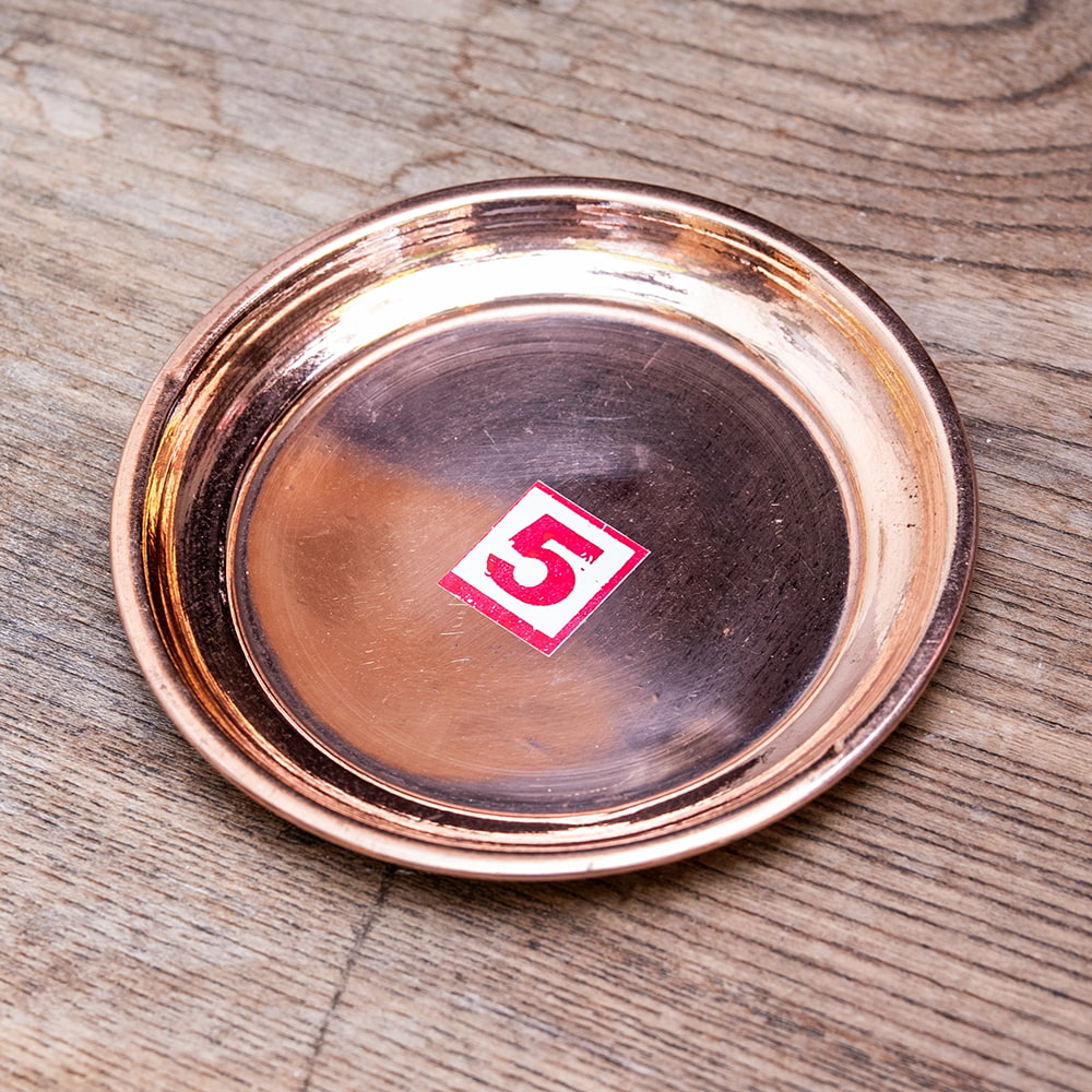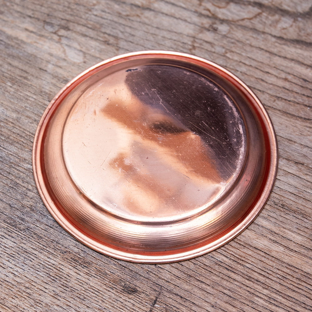 インドでは、ヒンドゥー教の宗教用品として、おかずを盛り付けるために使用されている小皿です。銅はインドでは神聖な金属とされ、宗教的な場所などでよく使われています。ティラキタスタッフもガネーシャの大好物モーダカというお菓子をお供えしていたり、ガンジス河の水をいれていたりする風景を見たことがあります。■お手頃価格な銅仕上げ