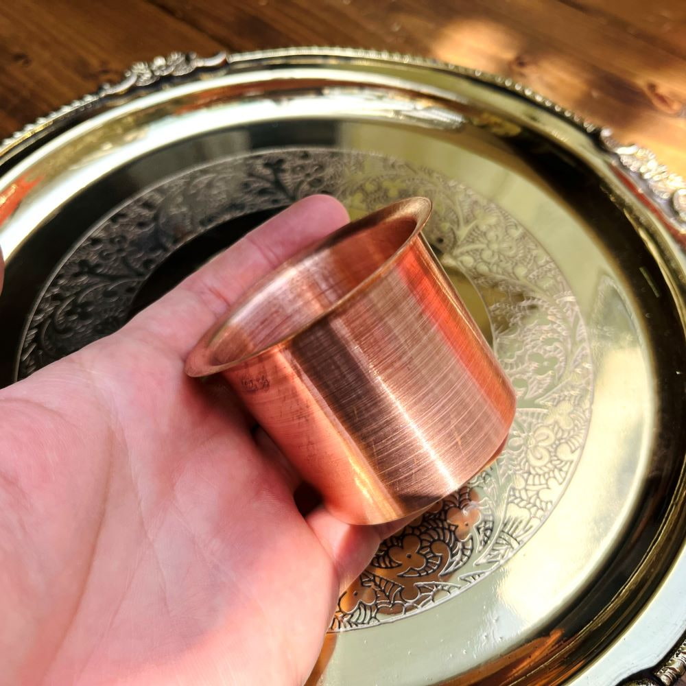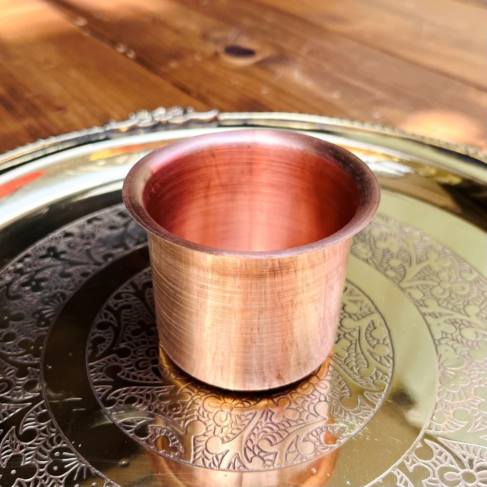 手のひらにすっと収まる、小ぶりな銅製カップは、インドのヒンドゥー教祭壇(プージャ)において、聖水やギー(澄ましバター)、米、花びら、香油などを捧げるために広く用いられてきた伝統的な道具のひとつです。その控えめながらも温かみのある輝きは、神聖な空間に穏やかな存在感を添え、祈りの時間をより静謐で深いものにしてくれます。インドでは古くから、銅は神聖な金属として重んじられ、浄化作用があると信じられてきました。特に水を銅の器に入れて飲む「タマラ・ジャル(銅水)」の習慣にも見られるように、銅は身体と精神の浄化を助ける素材として、日常生活と精神文化の双方で親しまれています。そのため、神々への供物を入れる器として銅製品が選ばれるのは、ごく自然なことでもあります。