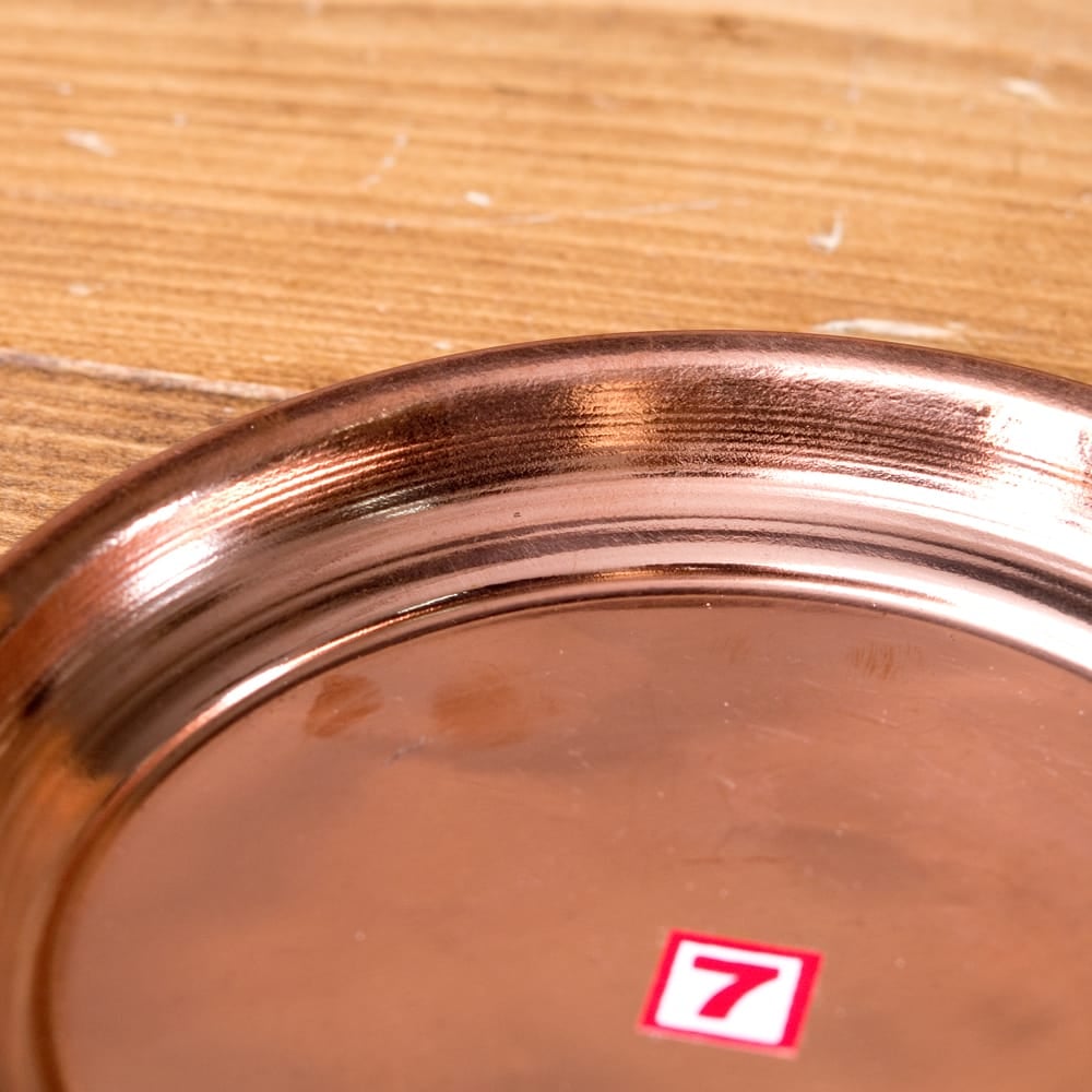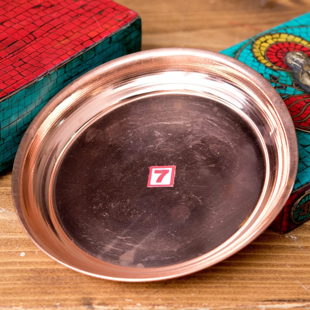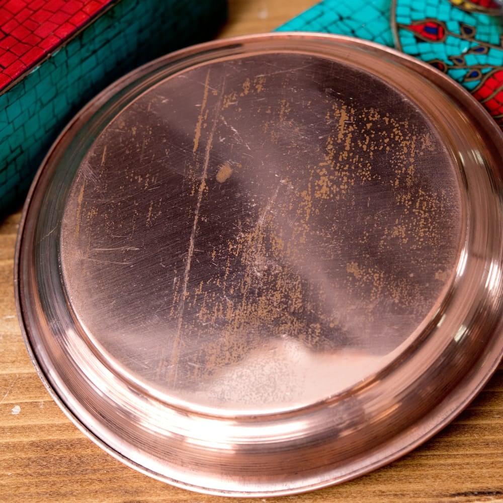 インドでは、ヒンドゥー教の宗教用品として、おかずを盛り付けるために使用されている小皿です。銅はインドでは神聖な金属とされ、宗教的な場所などでよく使われています。ティラキタスタッフもガネーシャの大好物モーダカというお菓子をお供えしていたり、ガンジス河の水をいれていたりする風景を見たことがあります。■お手頃価格な銅仕上げ