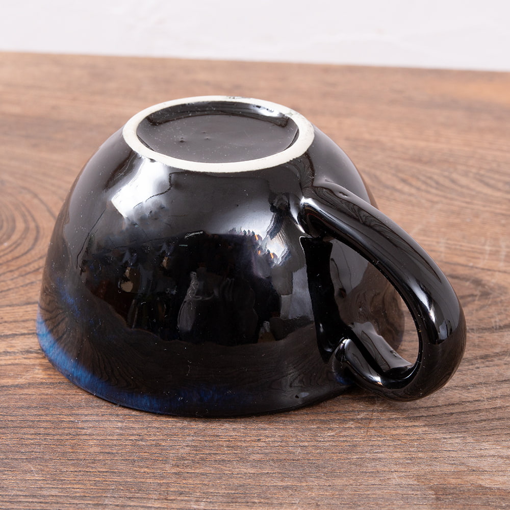 黒地に青い釉薬が美しく、かわいい花の形をしたお皿です。私は9cmの小さなボウルとセットで購入しましたが、同じシリーズのコーヒーカップとあわせてカップ&ソーサーにしてもよさそうですね。裏側は釉薬の抜けや気泡などが散見されます。(画像をご参照ください)まあ裏側だし目立たないから、いいか!
