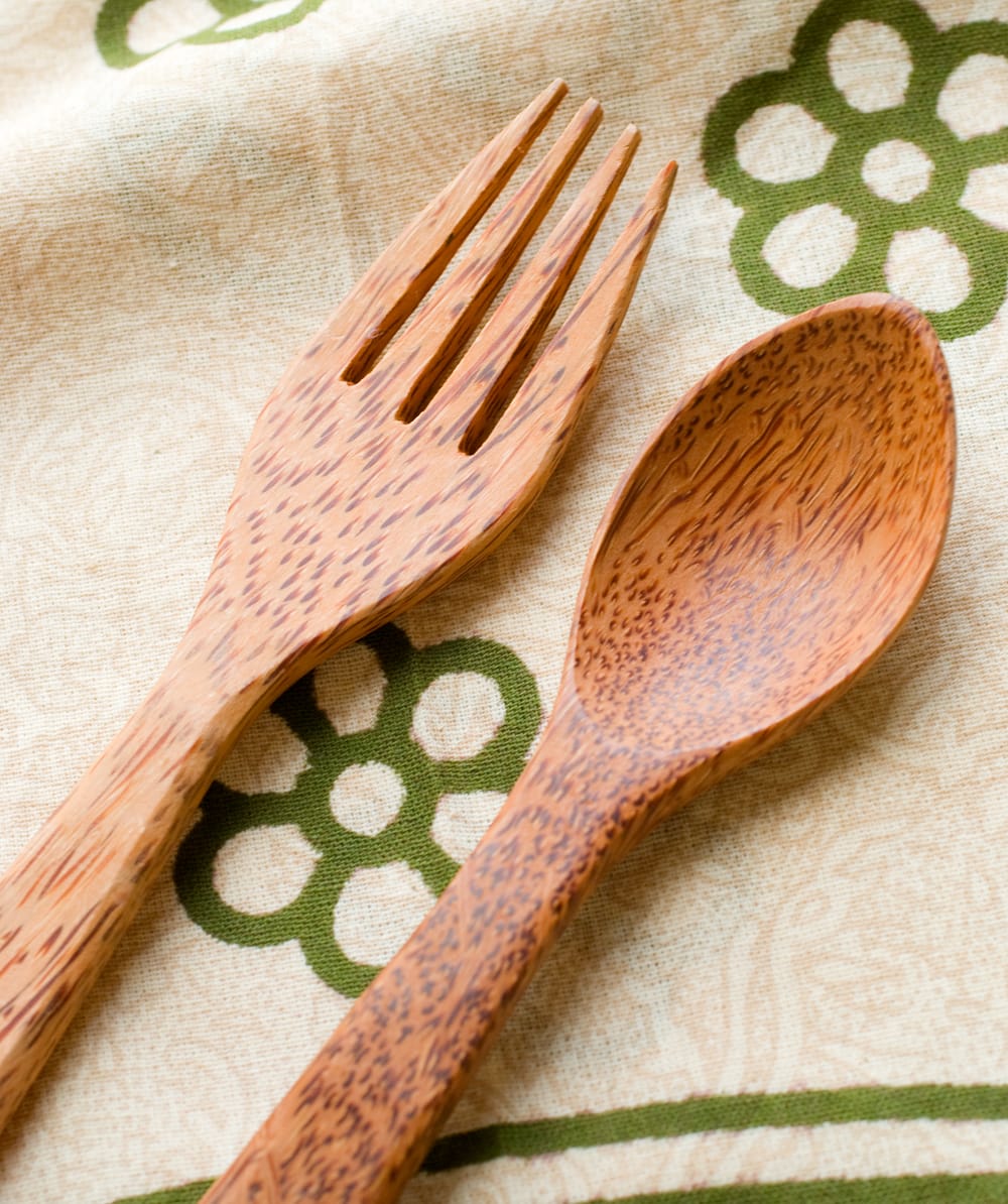 アジアンな雰囲気たっぷりのココナッツのフォークとスプーンがやってきました。ココナッツの木を彫り込んで作られたため、鋳造しているものと同様に切れ目などがありません。