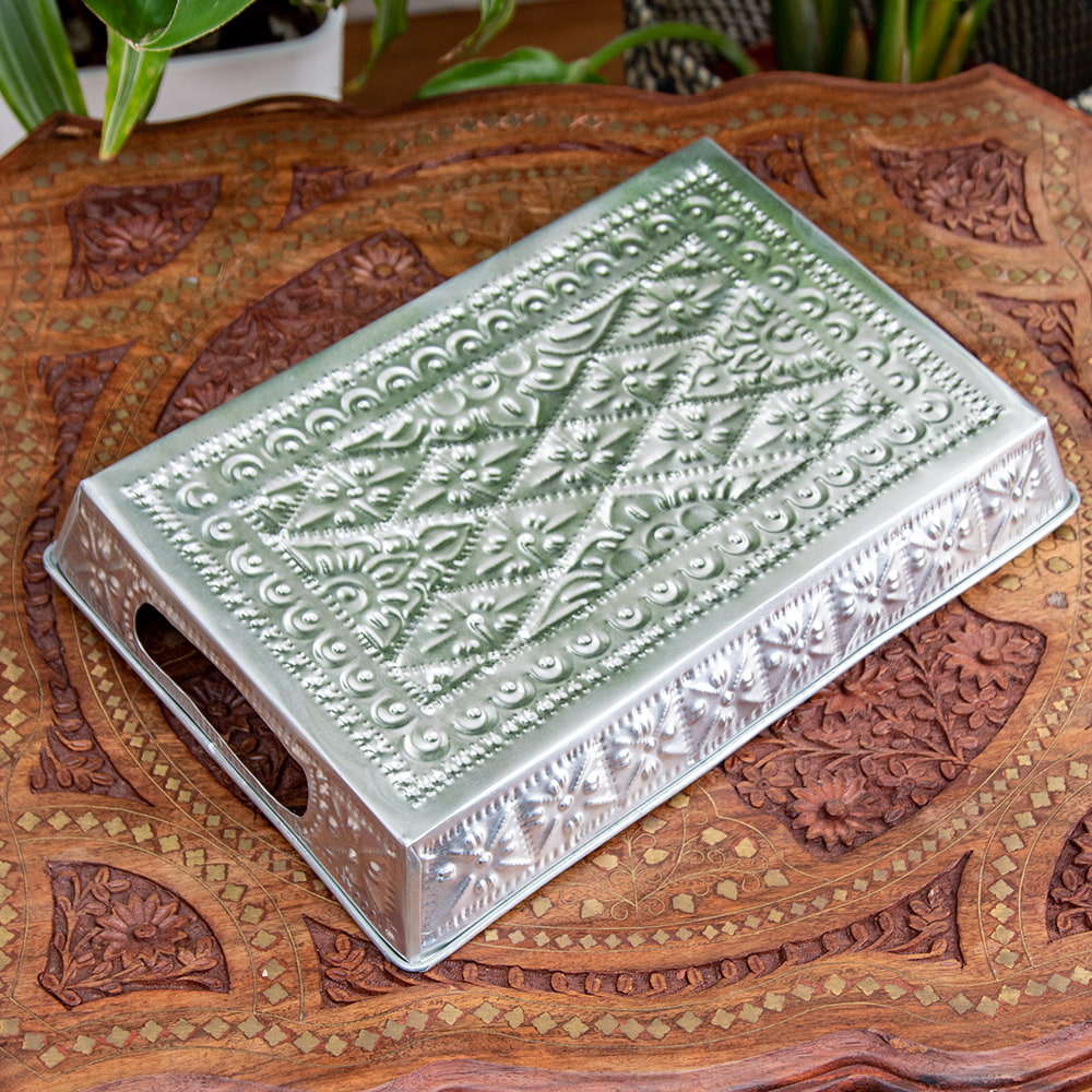 バリのアルミ細工トレイ - Lサイズ 幅:約38cm