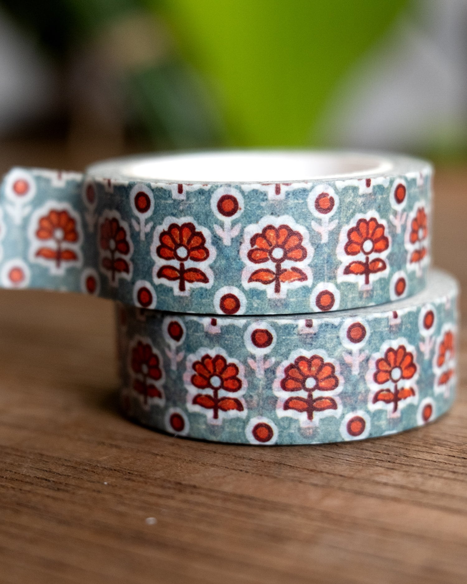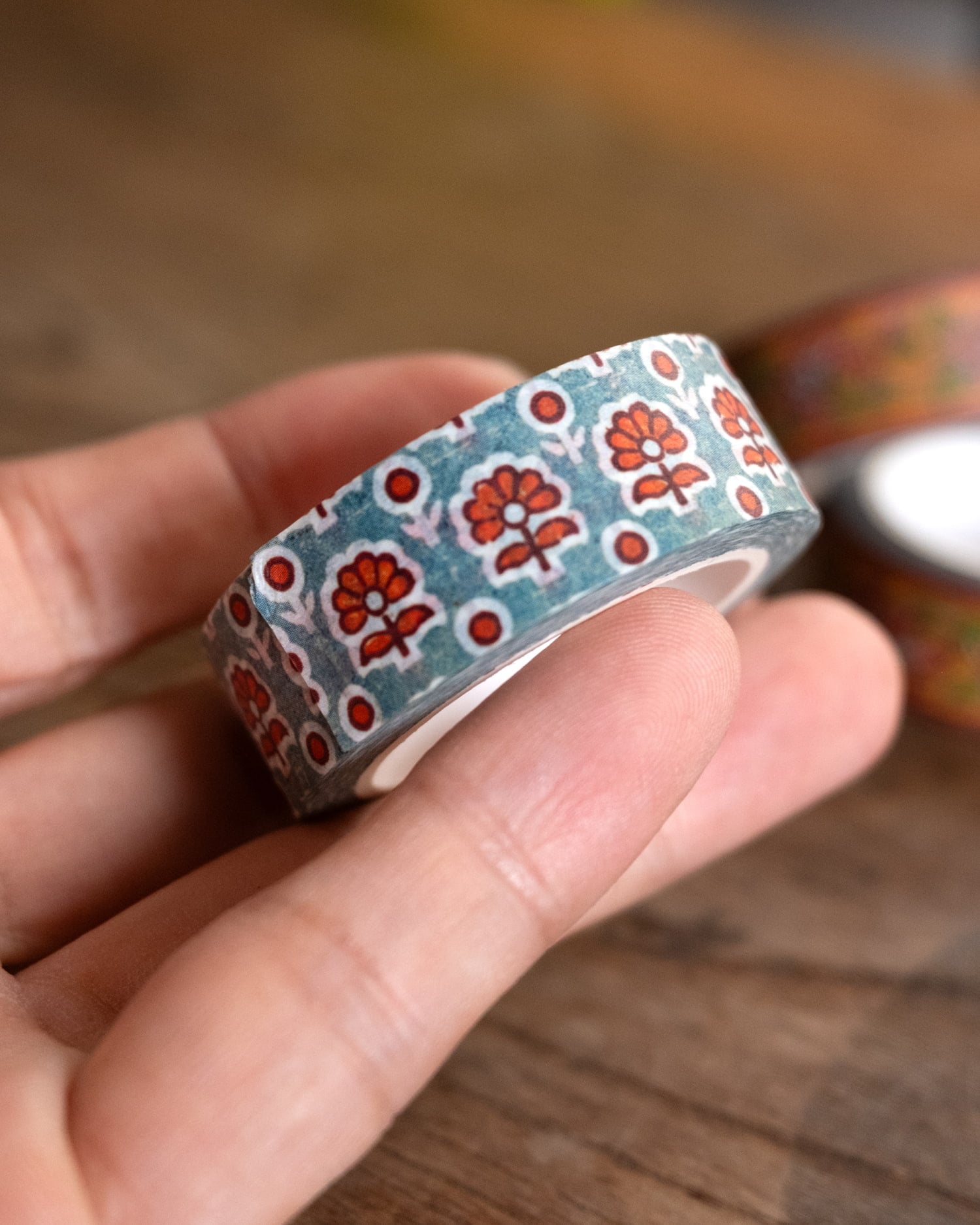 【6個セット】ブルー・オレンジ小花柄-ティラキタオリジナル マスキングテープ 15mm x 10m