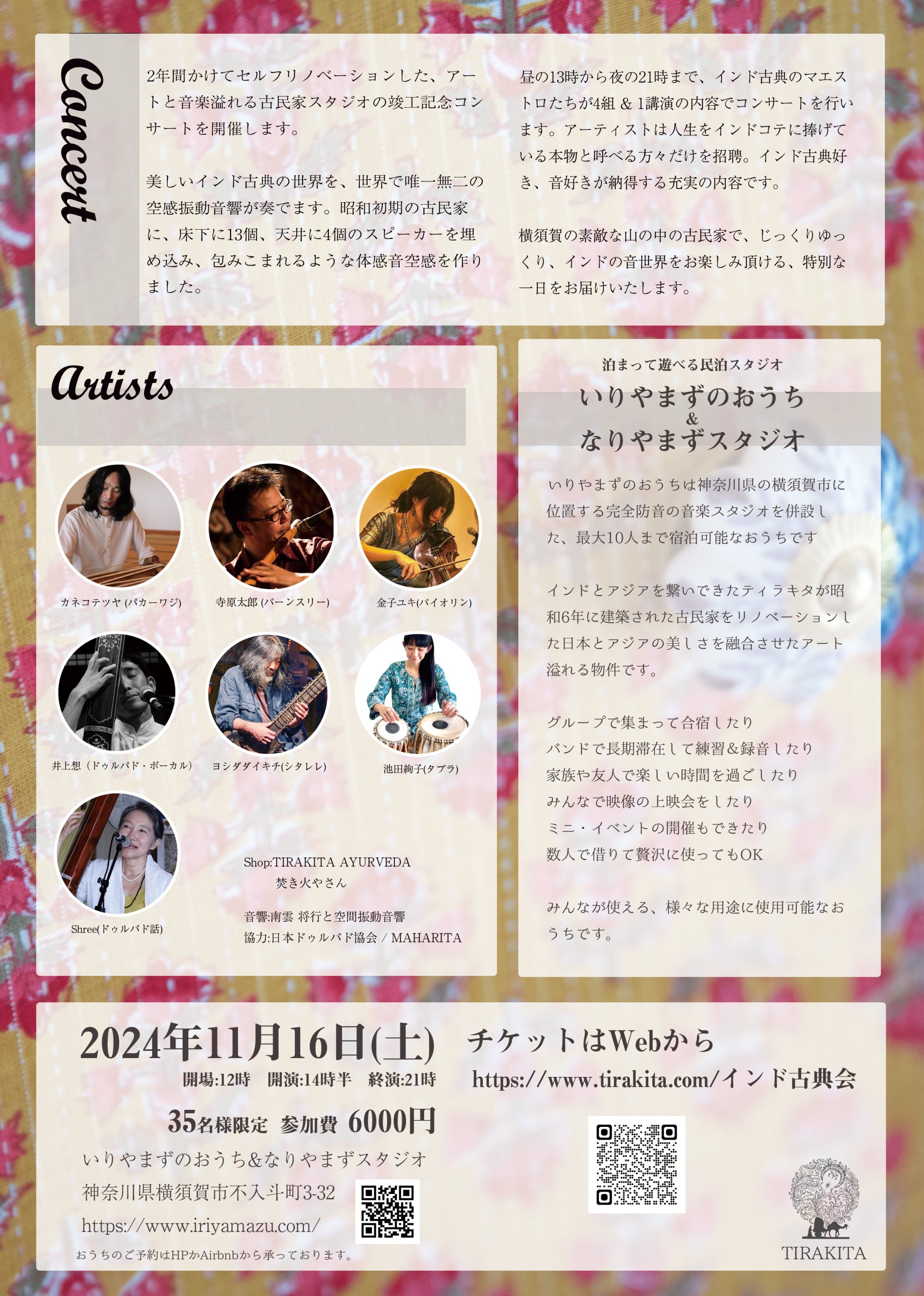 ![[E-TICKET・35名様限定]空間振動音響とインド古典の会 - 11月16日(土) 2 - フライヤーの裏面です](https://www.tirakita.com/Zakka2/Photos/event_iriyamazu2024_1_2b.jpg)